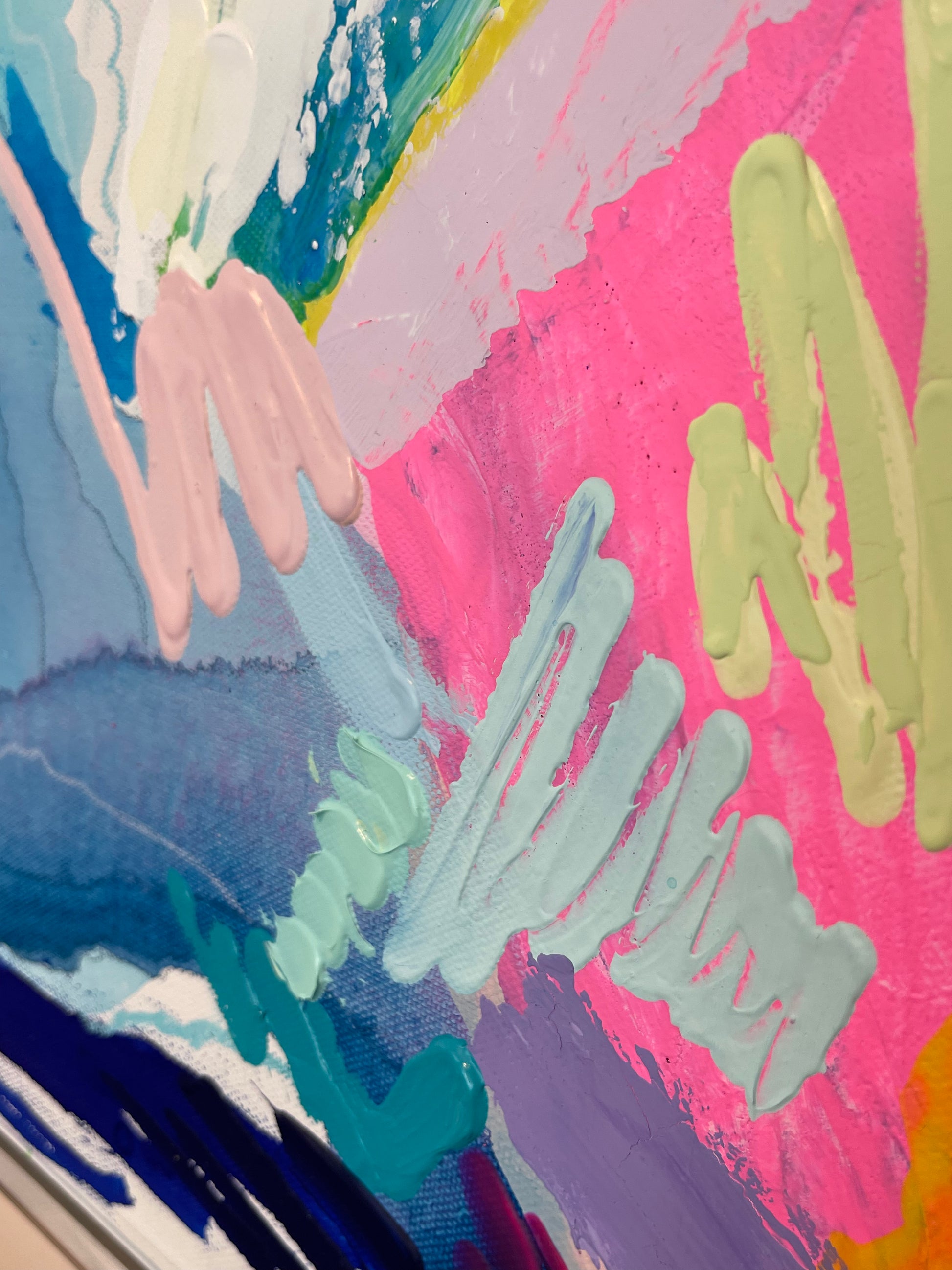 Bring dynamic motion and bold energy into your space with "Ariel". This abstract painting features expressive brushwork in deep navy, vivid pinks, and serene blues, accented with a wing-like white texture that evokes movement and transformation. The piece strikes a stunning balance between fluidity and form. Perfect for modern interiors, this artwork adds a splash of color and artistic flair to any room.