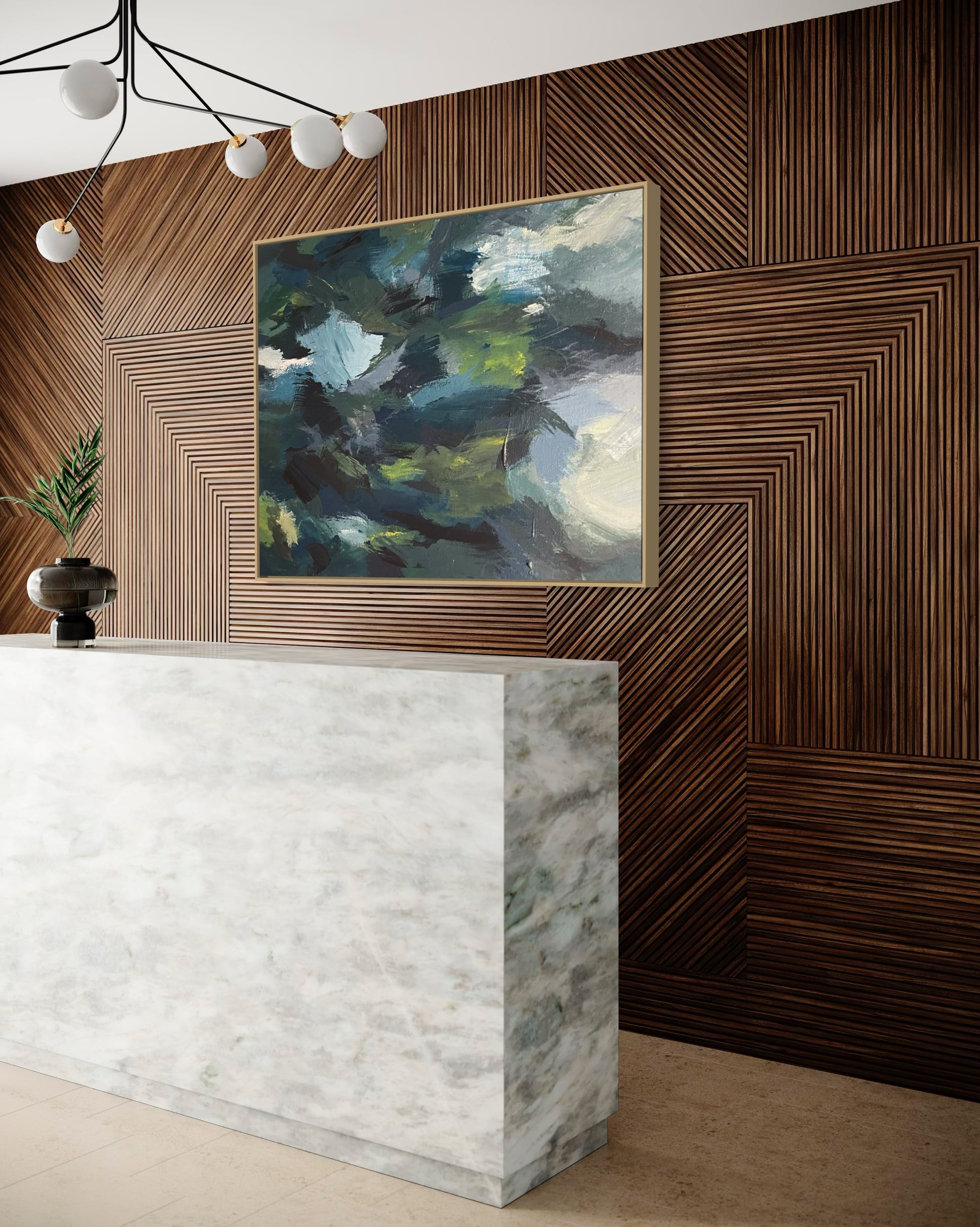 “Birds of a Feather” is a rich and moody abstract painting that evokes the feeling of quiet connection and natural harmony. Deep forest greens, stormy blues, and gentle creams swirl together in layered brushstrokes, suggesting the hidden beauty of a wooded canopy where birds might gather unseen. This piece captures the essence of nature’s depth and complexity, perfect for bringing a grounded, contemplative energy into any living room, office, or gallery wall. Ideal for lovers of modern expressionist art and nature-inspired interiors.