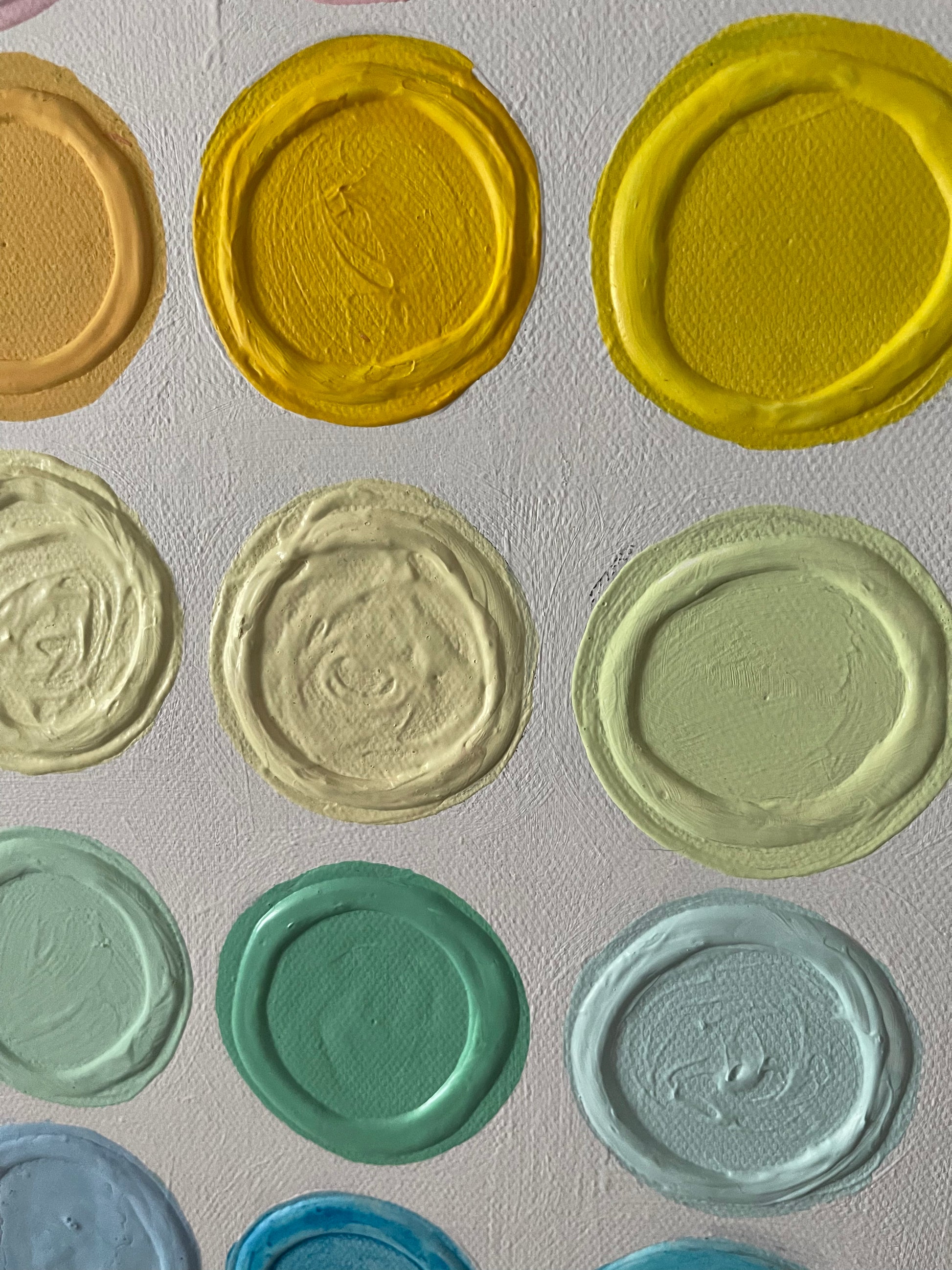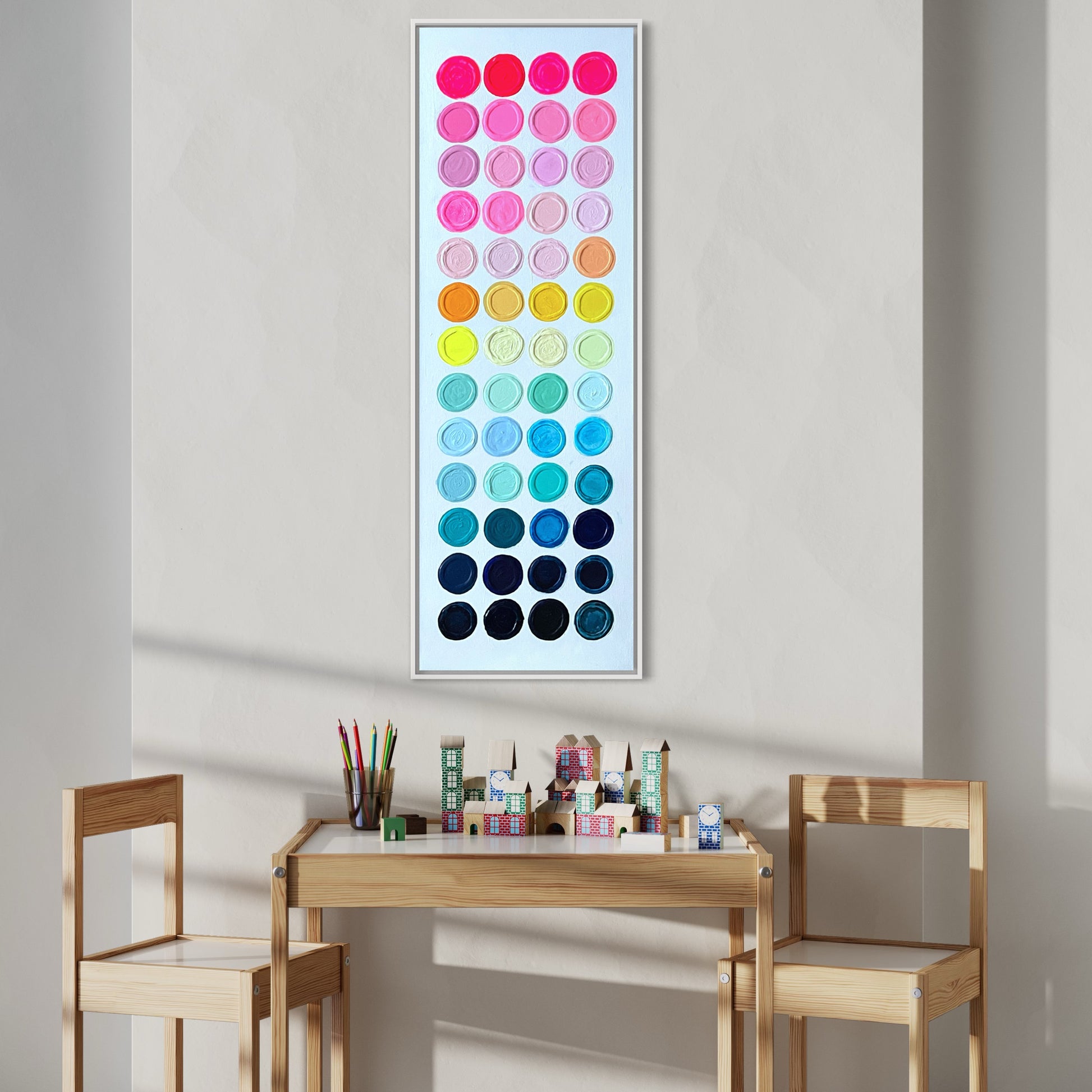Bring joy and color into your space with Candy Buttons, a playful and nostalgic piece that transforms the simplicity of circular shapes into a symphony of color. Inspired by the vintage candy of the same name, this artwork features meticulously painted rows of raised, round "buttons" in a vibrant gradient—from electric pinks and soft pastels to bright citrus tones and calming ocean hues. Each circle is hand-painted in thick, luscious strokes of acrylic, creating a three-dimensional texture that dances with light and shadow. This vertical canvas adds a pop of modern whimsy and tactile beauty to any room, making it perfect for playful interiors, creative studios, or children's spaces.