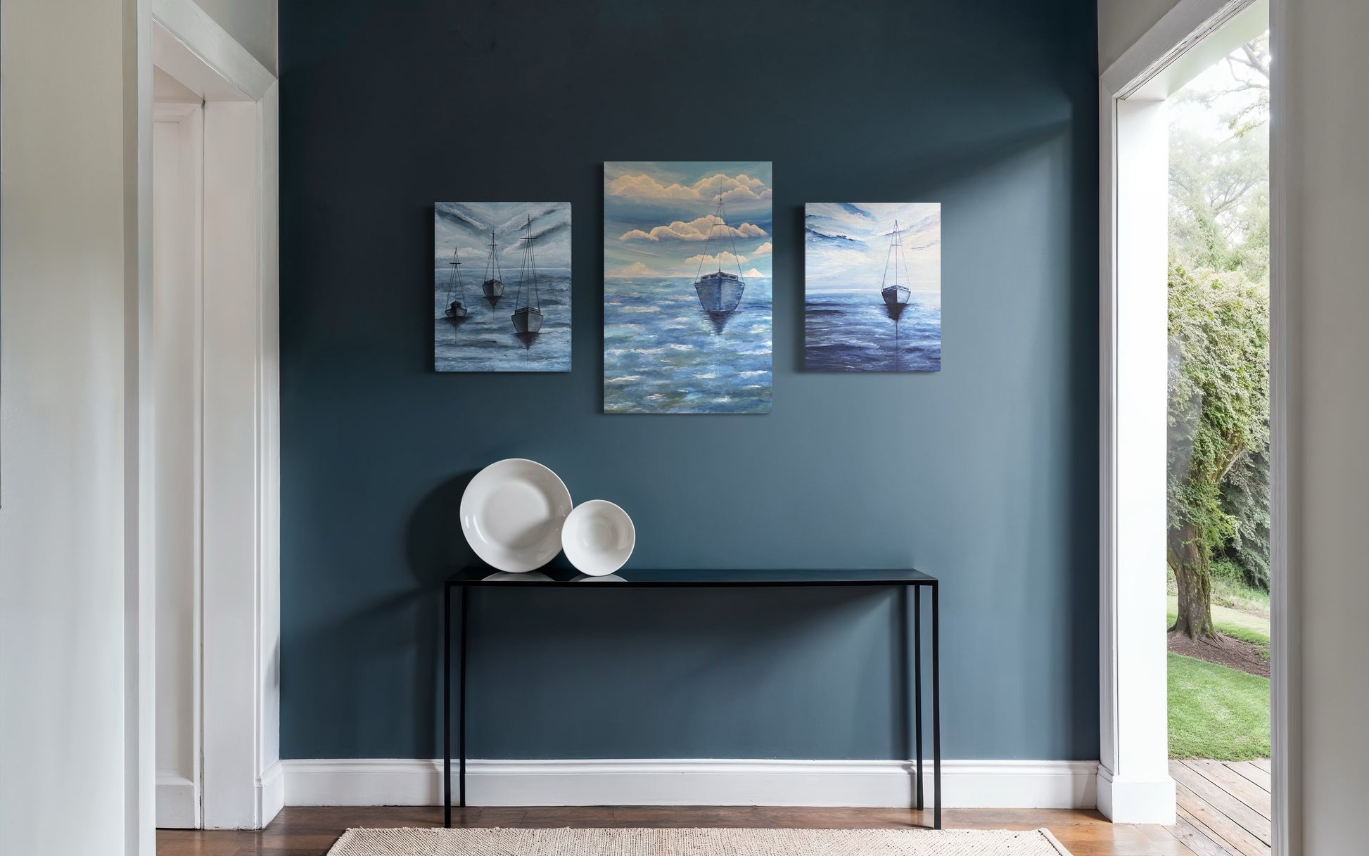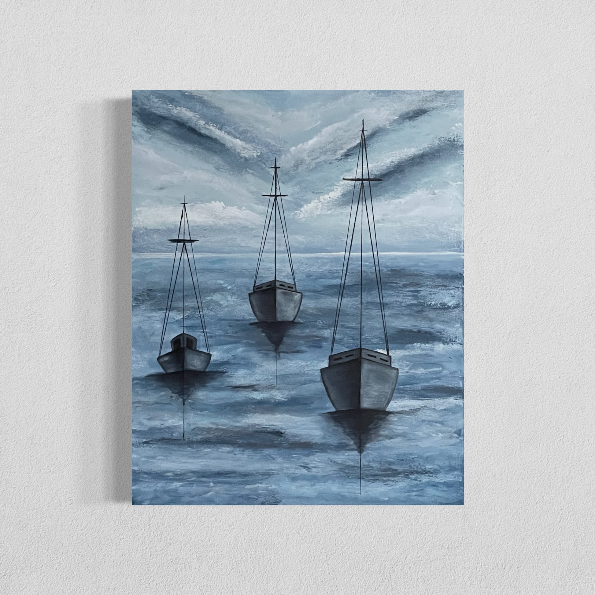Monroe Harbor Chicago s an original acrylic painting of three sailboats in monochromatic blues on stretched cotton canvas with a 7/8" profile.