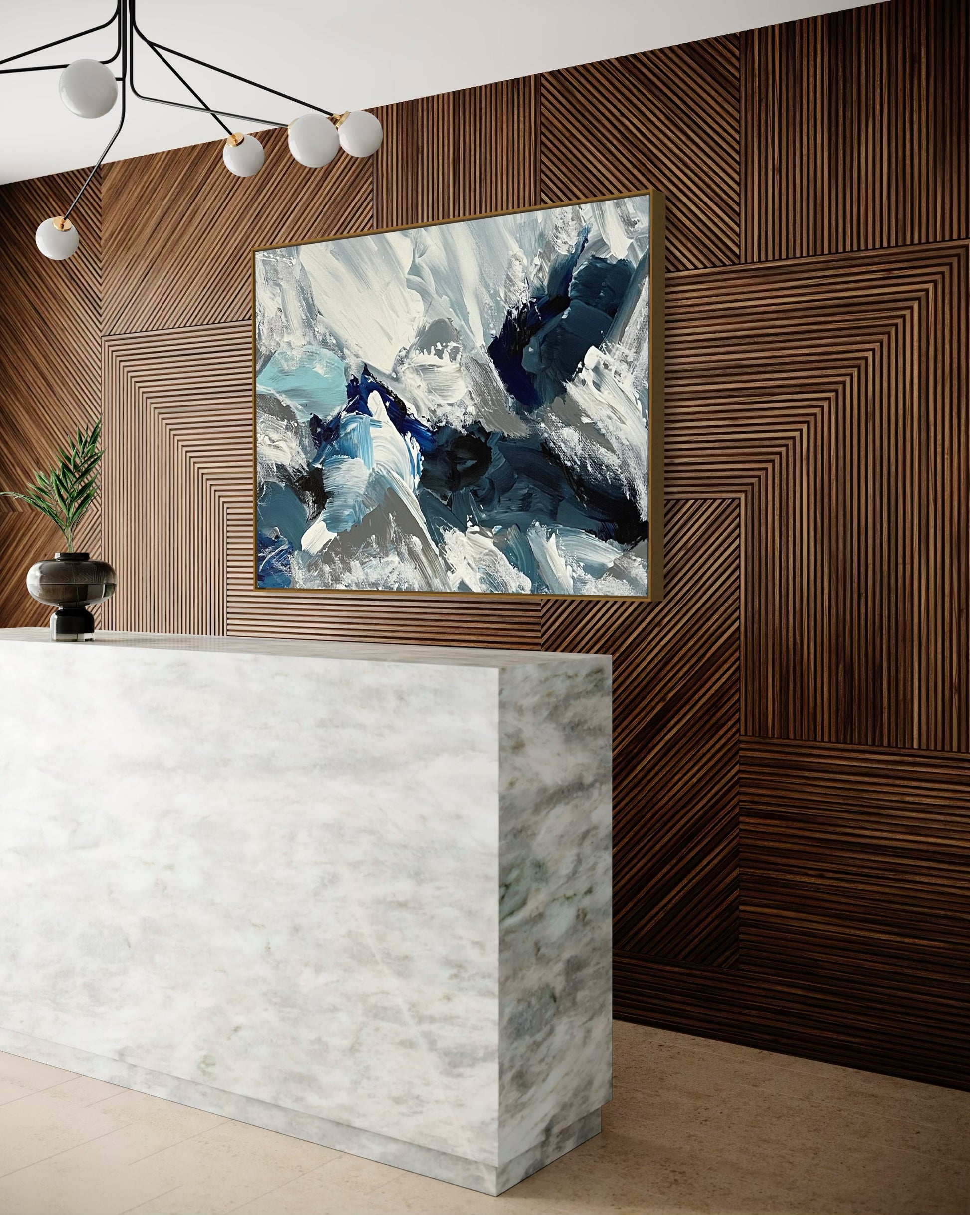 Crushed Ice is a striking abstract painting that captures the raw, untamed energy of a winter storm. With dynamic brushstrokes in crisp whites, icy blues, and deep navy, the composition evokes the sharp splinters and glacial textures of frozen landscapes. The layered palette creates movement and depth, mimicking the sensation of cracking ice or snow-blasted rock faces. Perfect for modern interiors, Crushed Ice delivers cool intensity with a minimalist edge—an ode to nature’s chilling beauty.