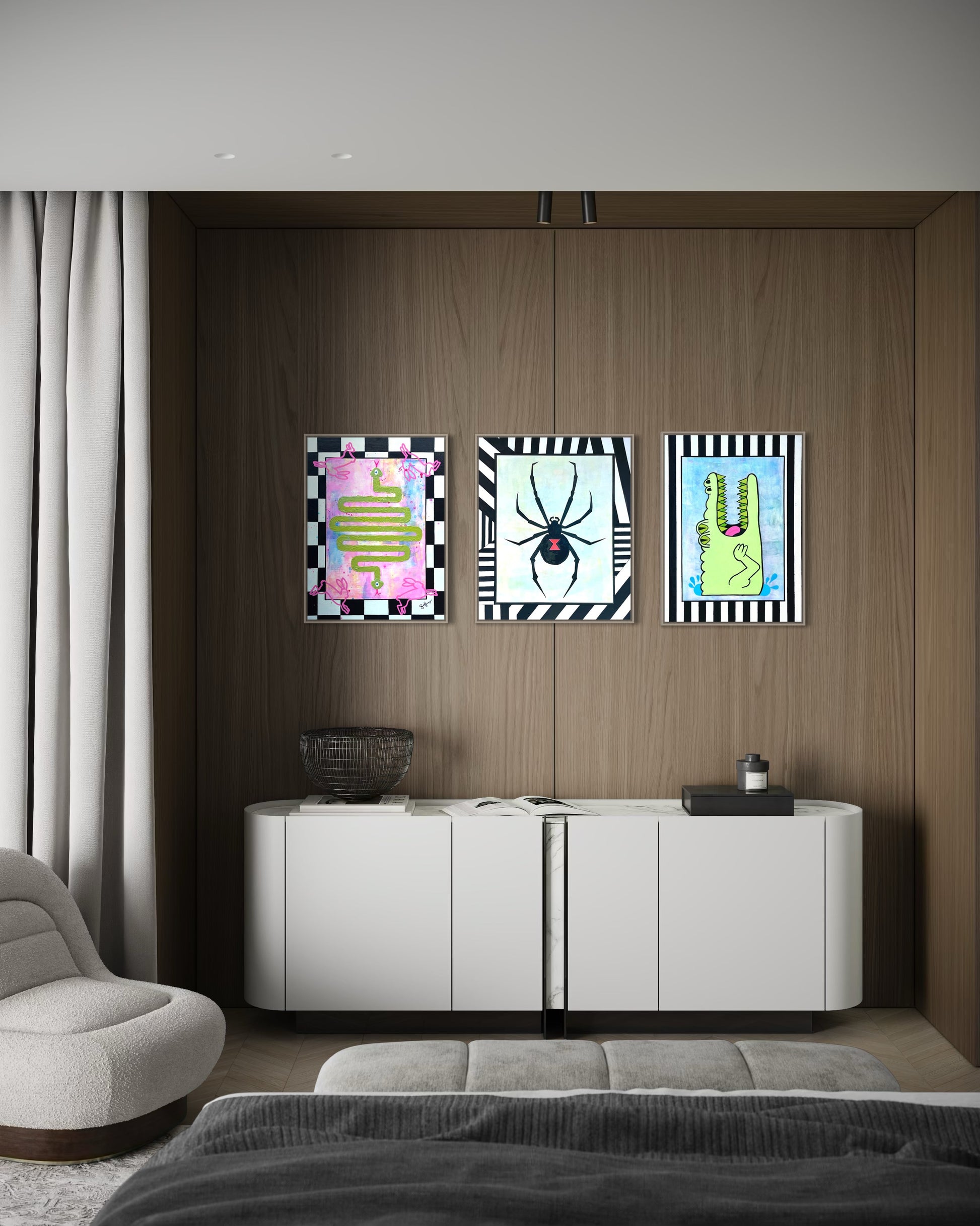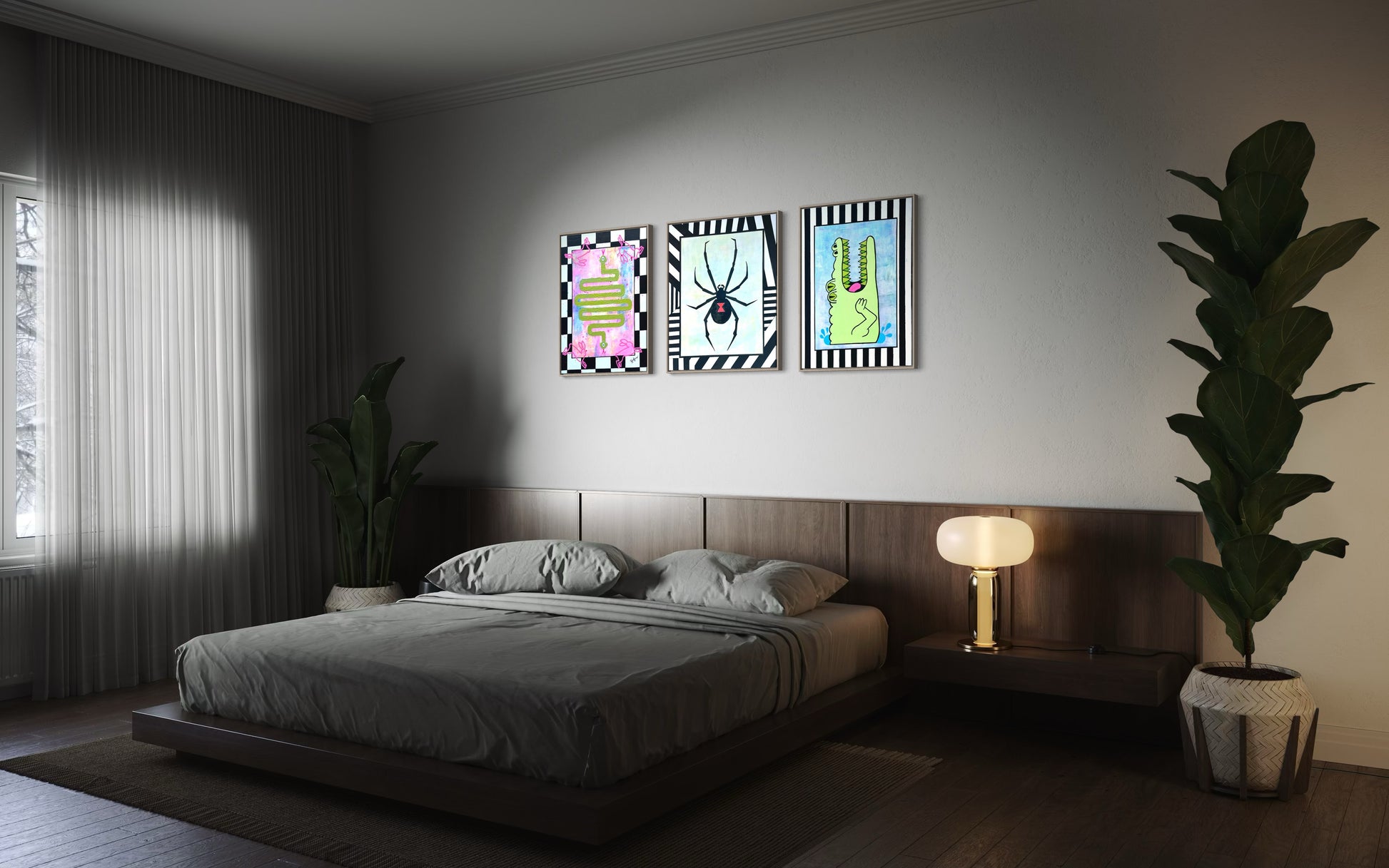 This piece is about the masks we wear and the absurdity of deceit—playfully hinting at the drama hidden just below the surface. Its comic-book palette and dynamic lines capture emotional intensity while staying delightfully offbeat. “Deceit Feet” is the perfect choice for collectors who love character-driven art that sparks curiosity and conversation.
