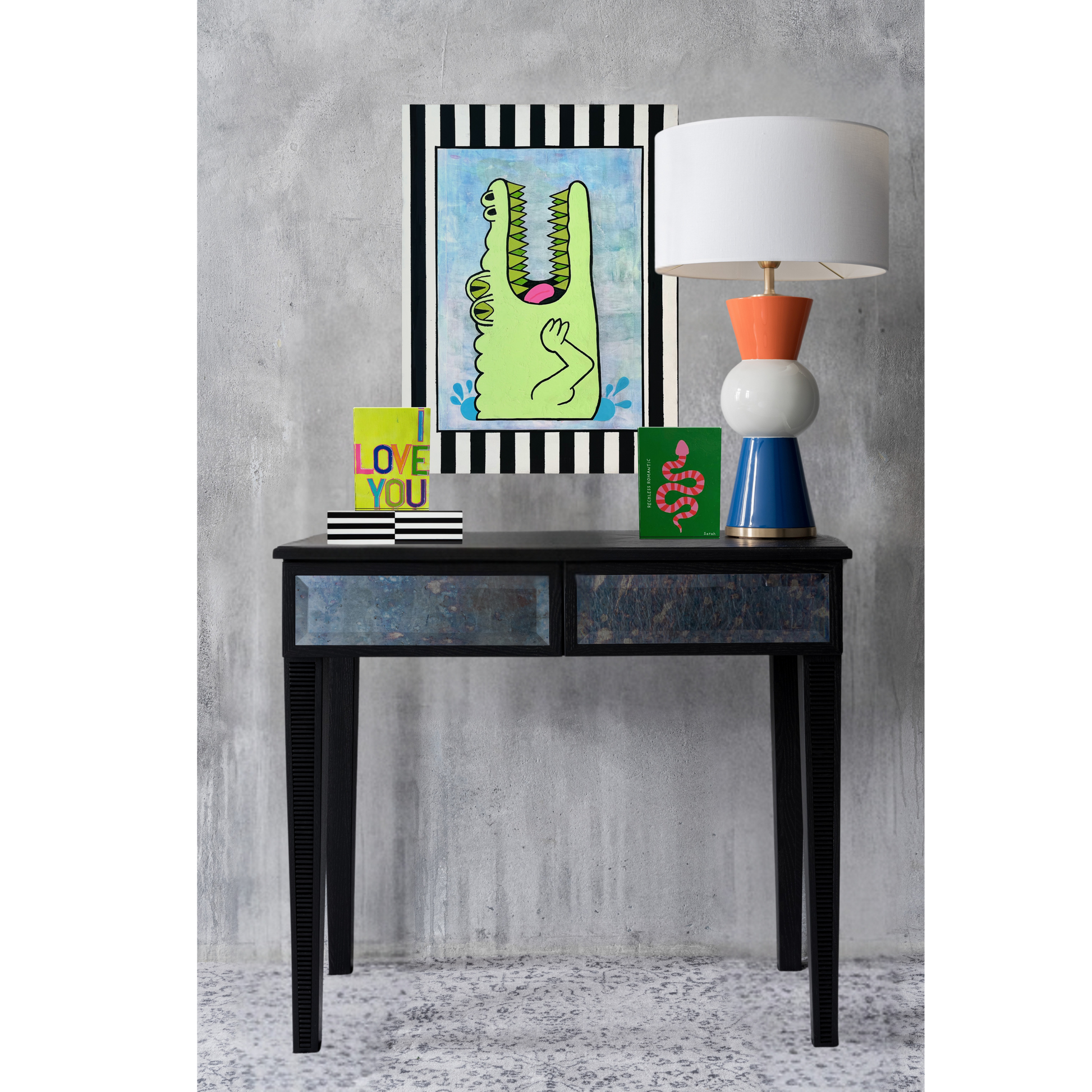 Deceit Feet is a bold, tongue-in-cheek entry in the Expressionism Collection that blends playful imagery with a deeper emotional undercurrent. This vivid painting features a stylized green crocodile figure with exaggerated zig-zag teeth, expressive hand gestures, and a wide-open mouth—caught mid-expression. Framed by graphic black-and-white stripes, the figure bursts with personality and satire, challenging the viewer’s assumptions with humor and edge.