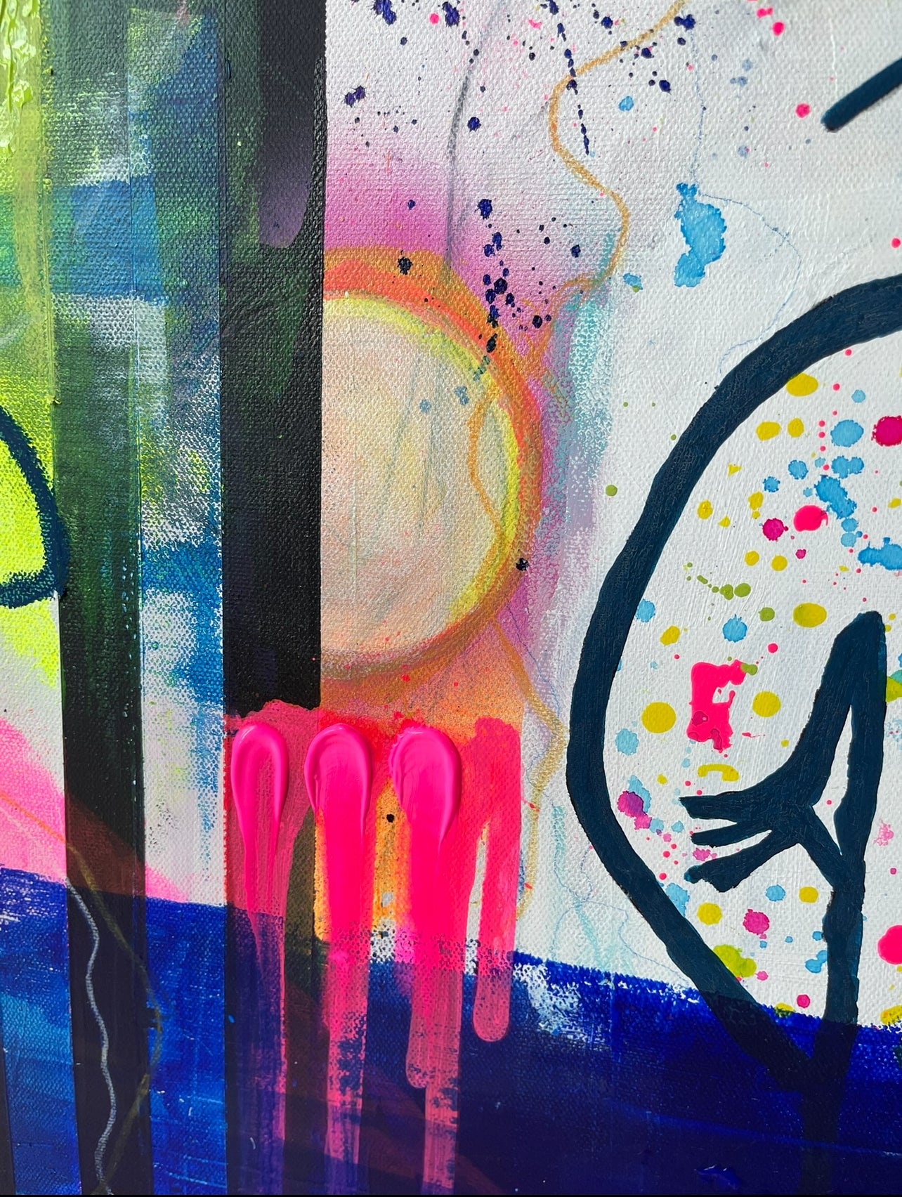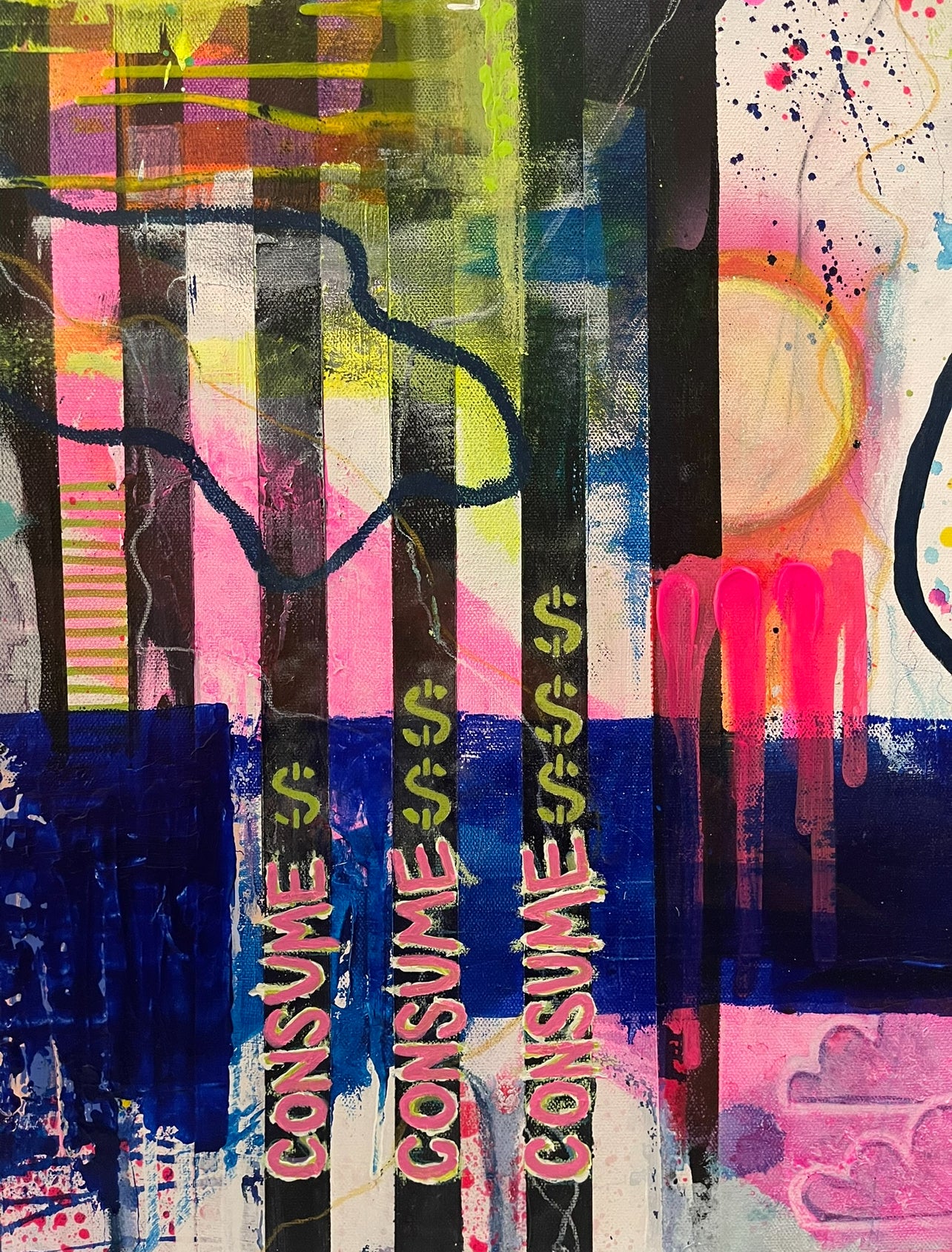 The rabbit centered in the painting, Fred, is consistent with some of the rabbits that show up in my other expressionist and surrealist works. I lean into this character as a personification of the universe guiding my subconscious mind. Despite his representation as a "guide" of thought, his whirled eyes show his own misguided confusion. He stands behind a thick boundary with his hands behind his back, suggesting difficulty in moving forward with ease. To the left of him, a partial roasting sun reminds of climate change, while three parallel lines have graffiti markings of consume, consume, consume. Behind him, an electric mix of markings and layered colors show the anxious energy of his demeanor.
