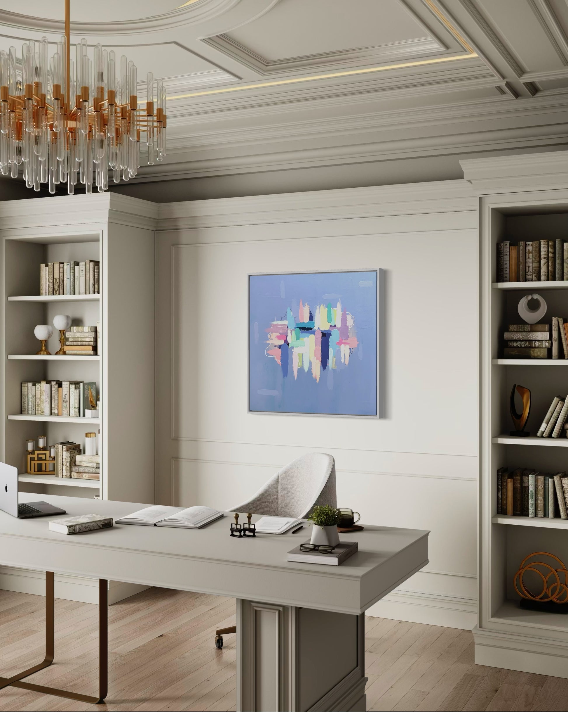 Enchanted is a 24"x24" heavily textured, mixed media painting on a gallery profile canvas that perfectly compliments grand millennial, soft modern, and preppy home decor. Comes ready to hang with a certificate of authenticity, no floater frame included.