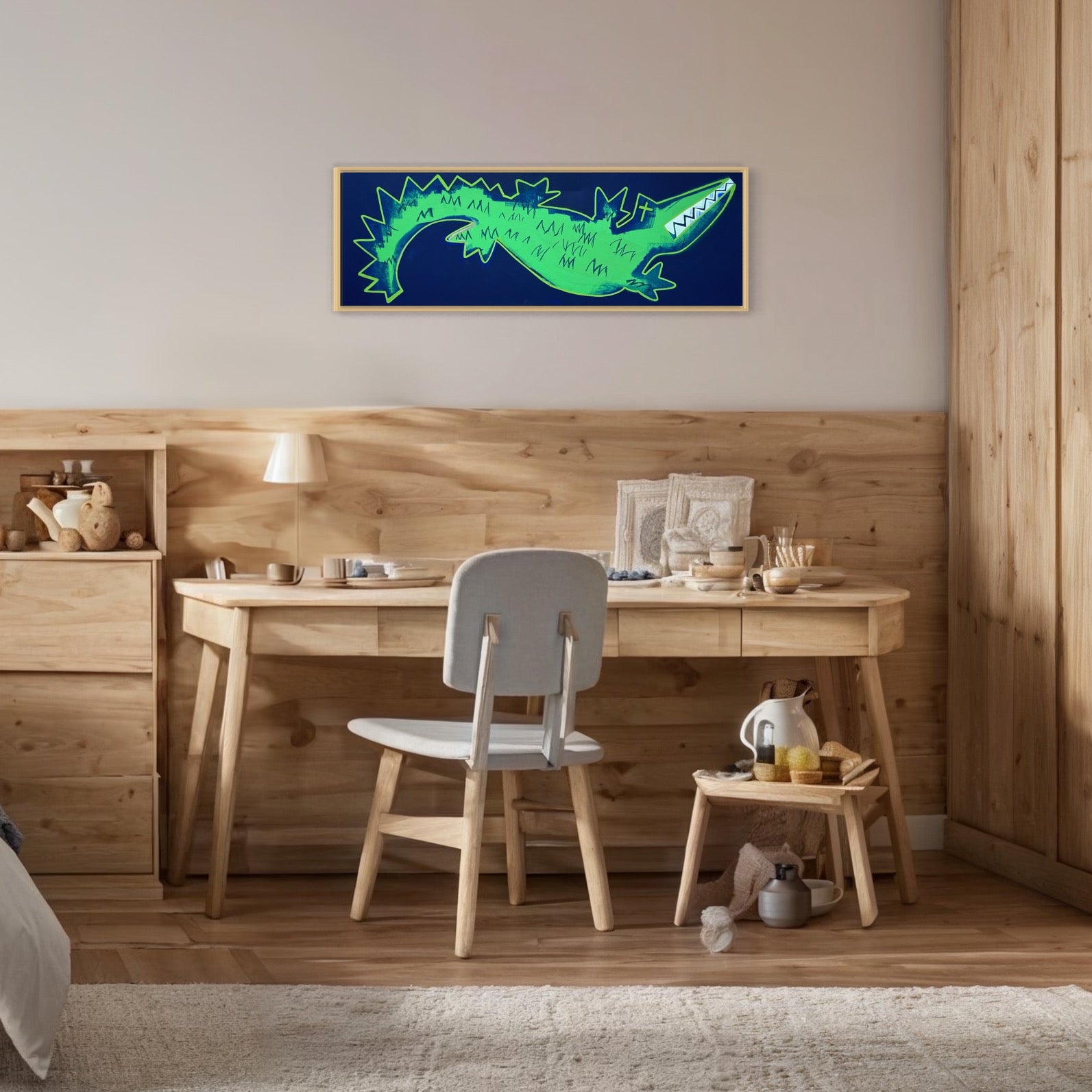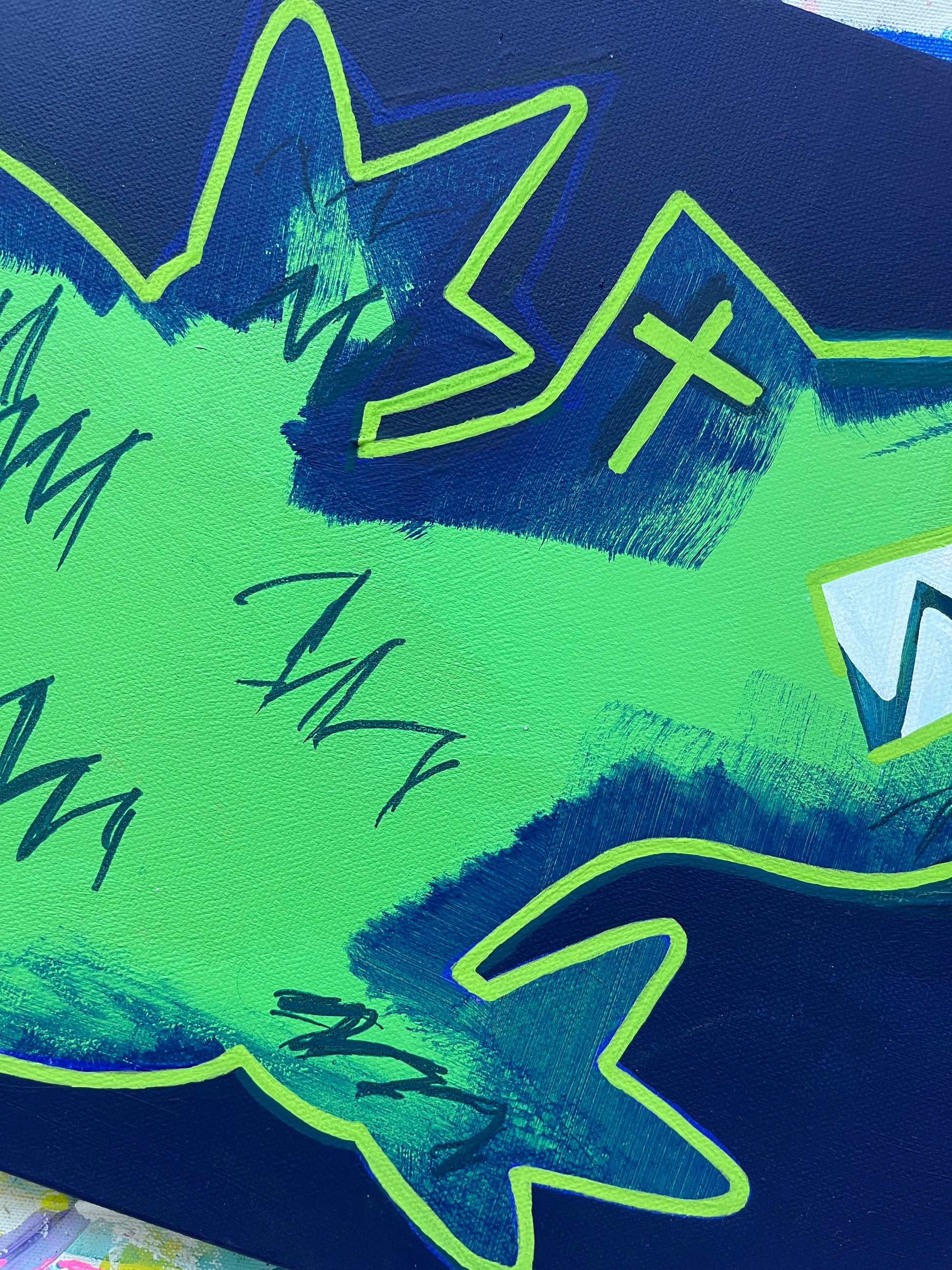 Everglator is a playful, yet poignant, piece from my Expressionism Collection where exaggerated forms and bold color choices are used to explore deeper emotional themes. This artwork features a stylized green alligator with jagged, toothy expression, humorously flattened into a navy canvas. Its cartoonish features and angular spikes evoke childhood nostalgia, while the deadpan x-eye introduces a darker undertone.