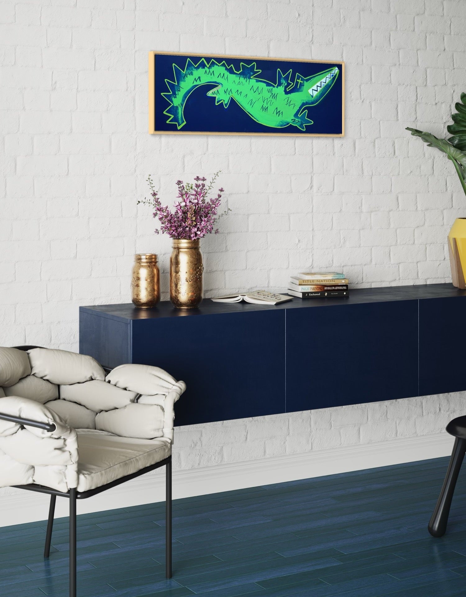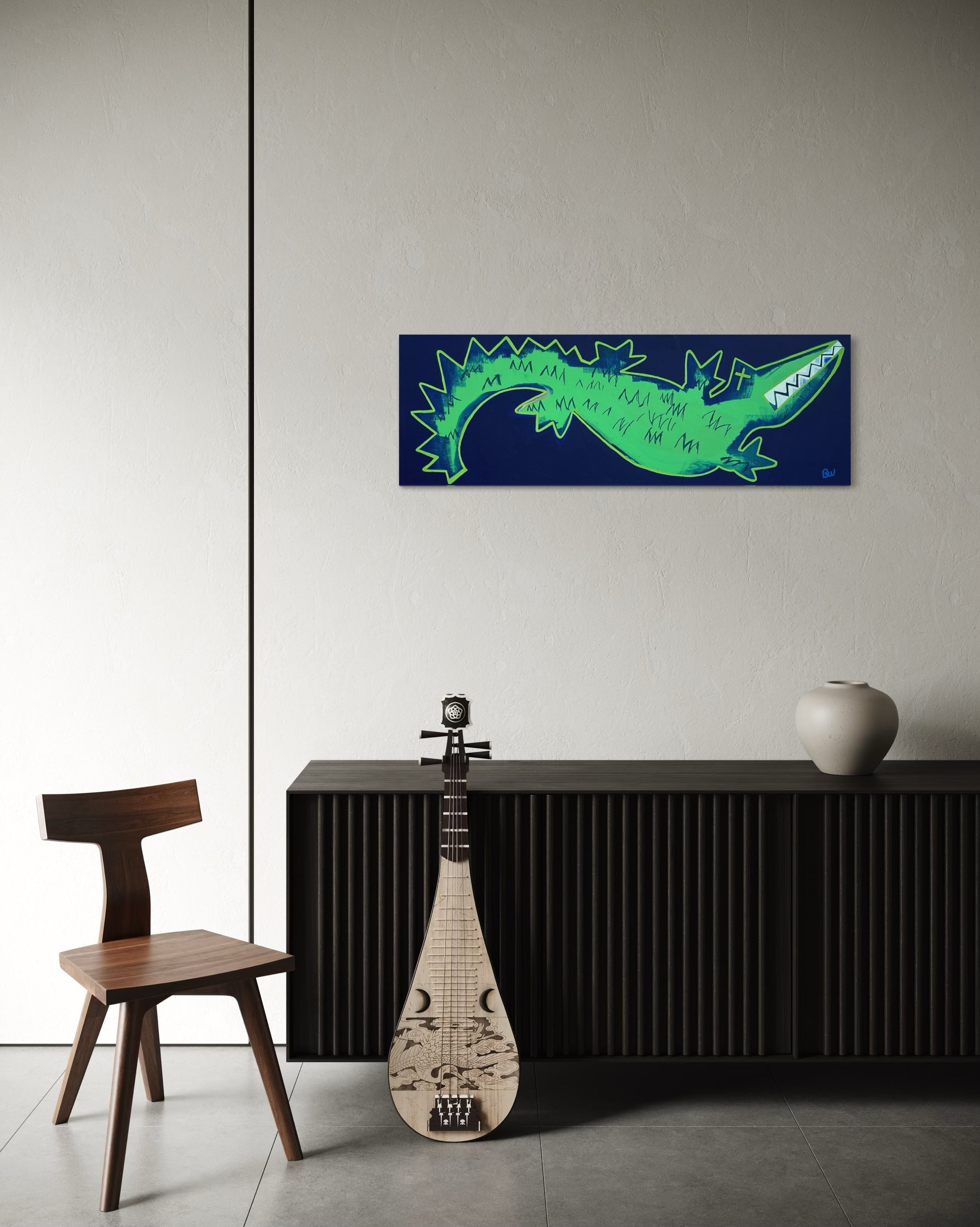 The simplicity of line and the contrast between vibrant green and deep navy reflect the core of expressionist intent: emotional resonance over realism. Whether interpreted as whimsical, cautionary, or symbolic, "Everglator" is a bold conversation piece that balances absurdity with artistic edge.