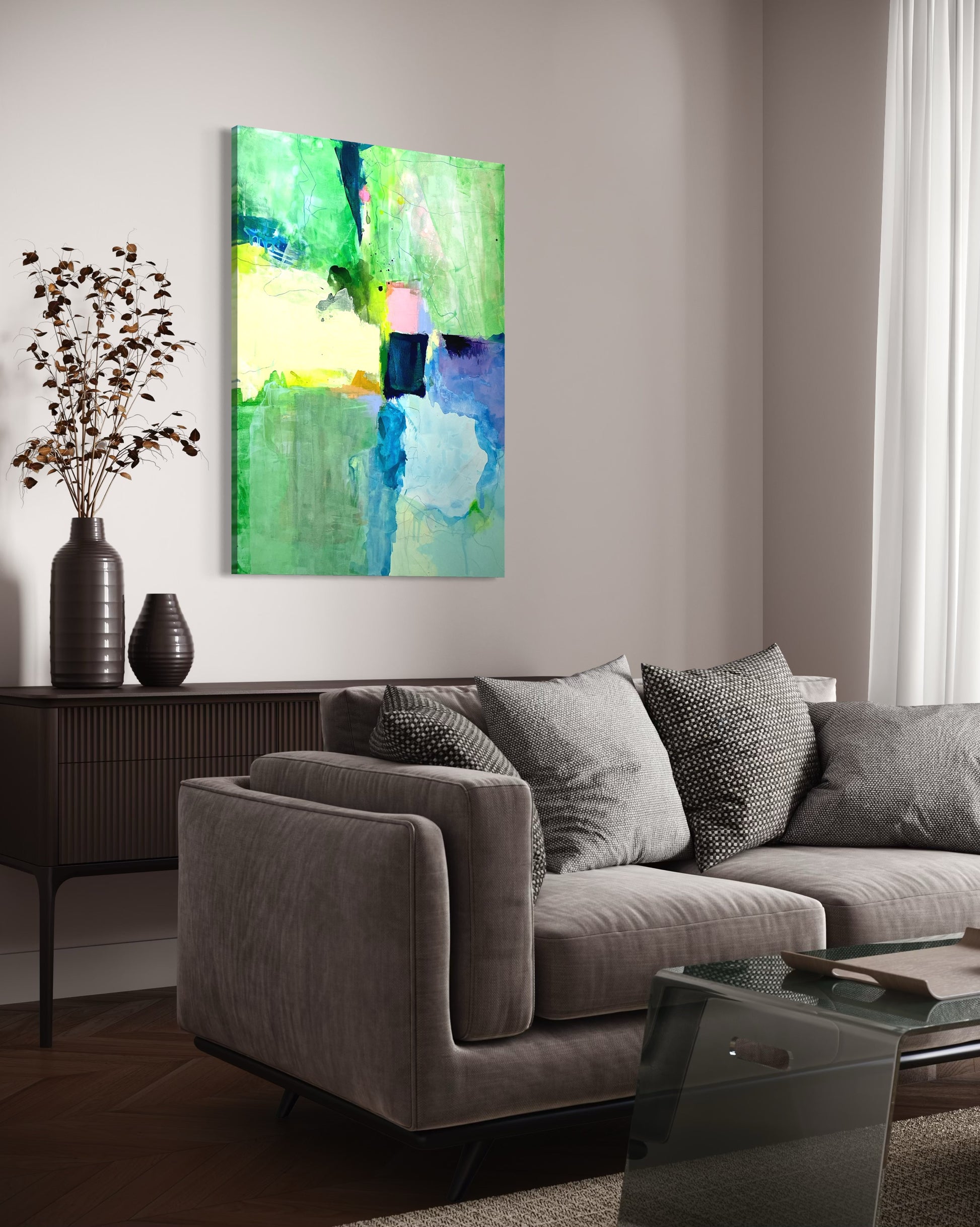Perfect for modern interiors, this expressive artwork adds movement and sophistication to any wall, whether displayed in a living room, office, or creative studio. Ready to hang and sure to spark conversation, Emerald Drift is a one-of-a-kind statement piece.