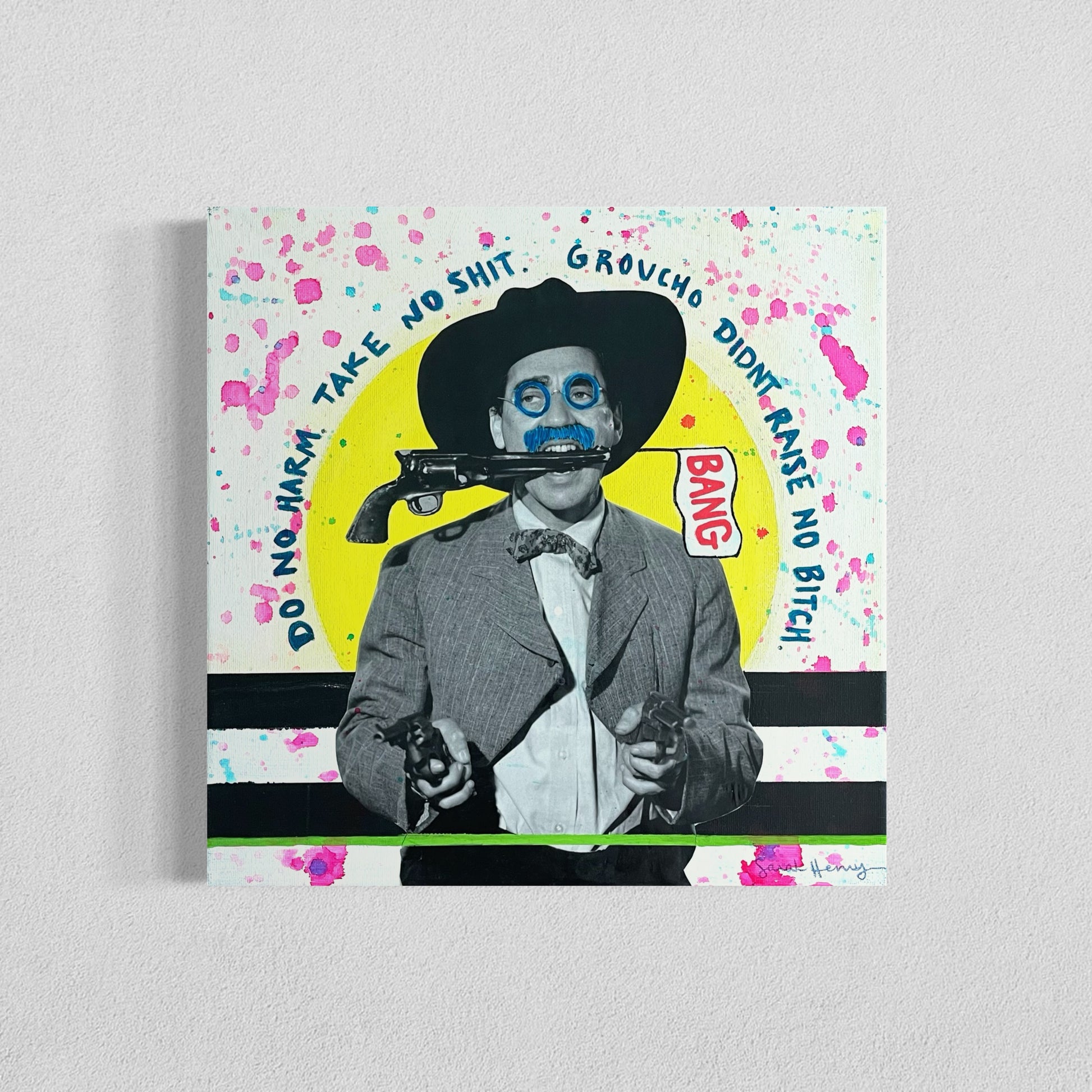 Groucho is a 12"x12" mixed media, abstract expressionist painting including a Groucho Marx decoupage and other abstract markings on a traditional profile, stretched cotton canvas.