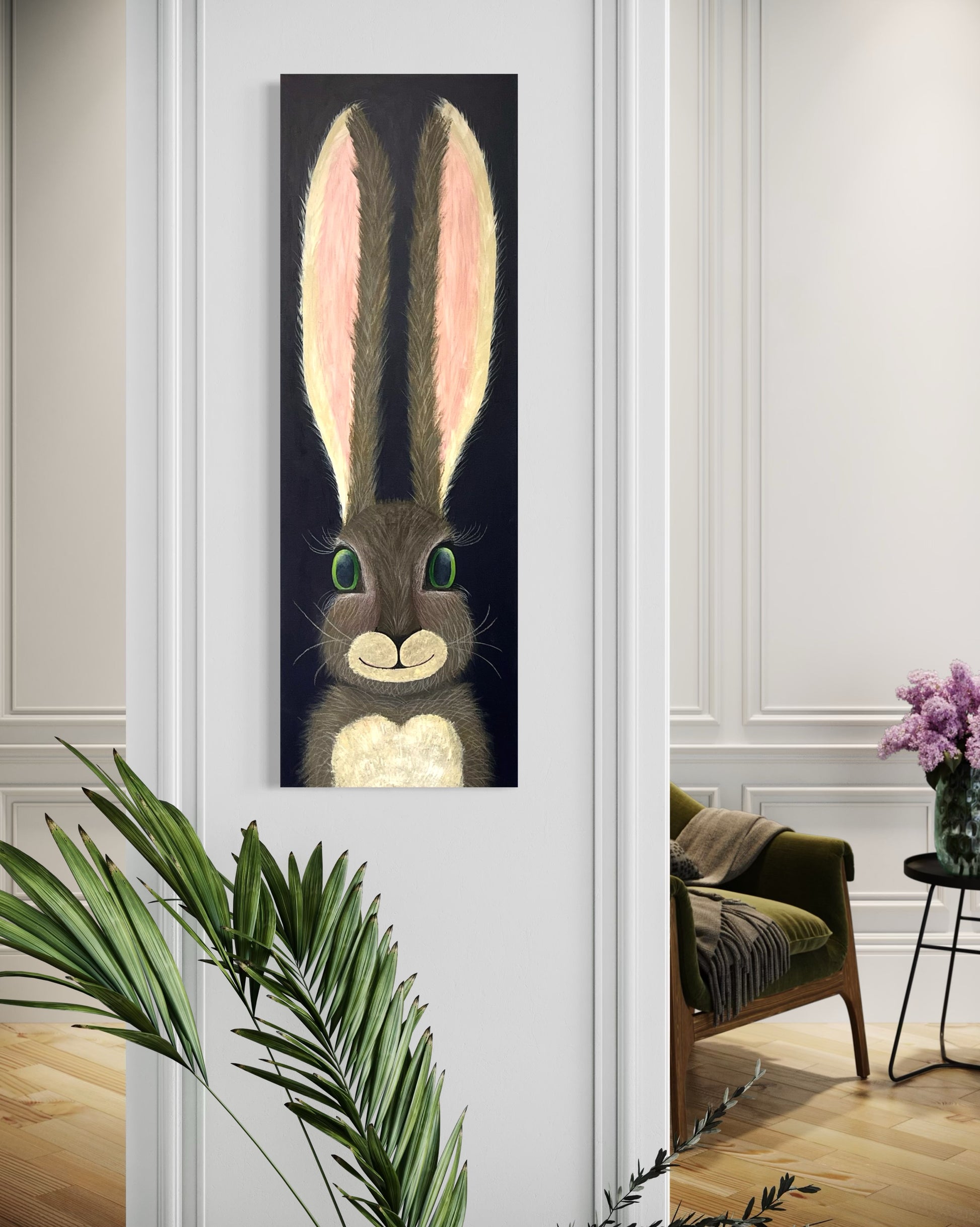 Harriet the Hare is a 12"x36" original painting of a brown/gray Jack Rabbit / Hare / Bunny with mesmerizing green eyes and long lashes against a navy blue background. This stretched canvas has a 7/8" thick profile. She comes ready to hang with a certificate of authenticity.