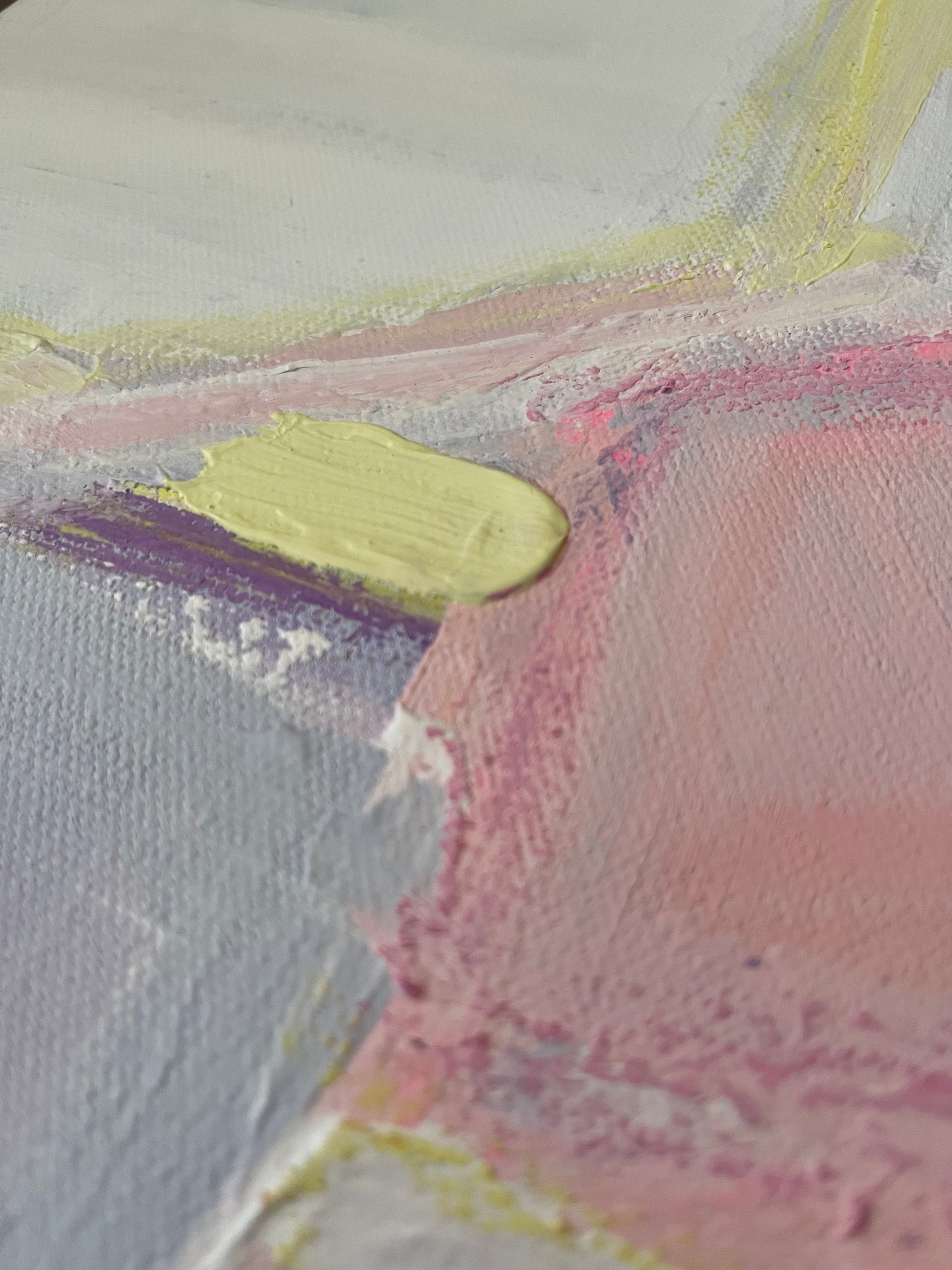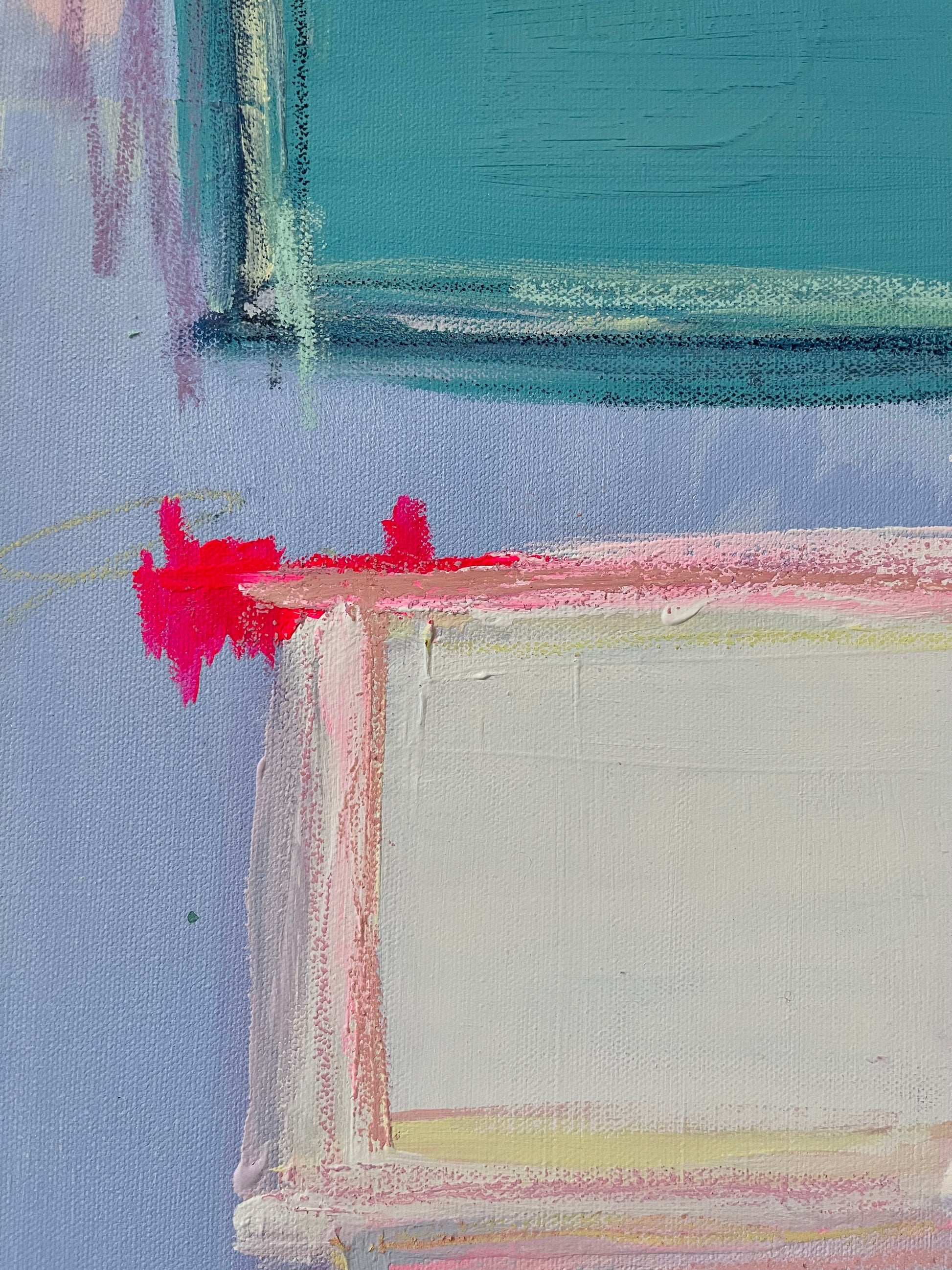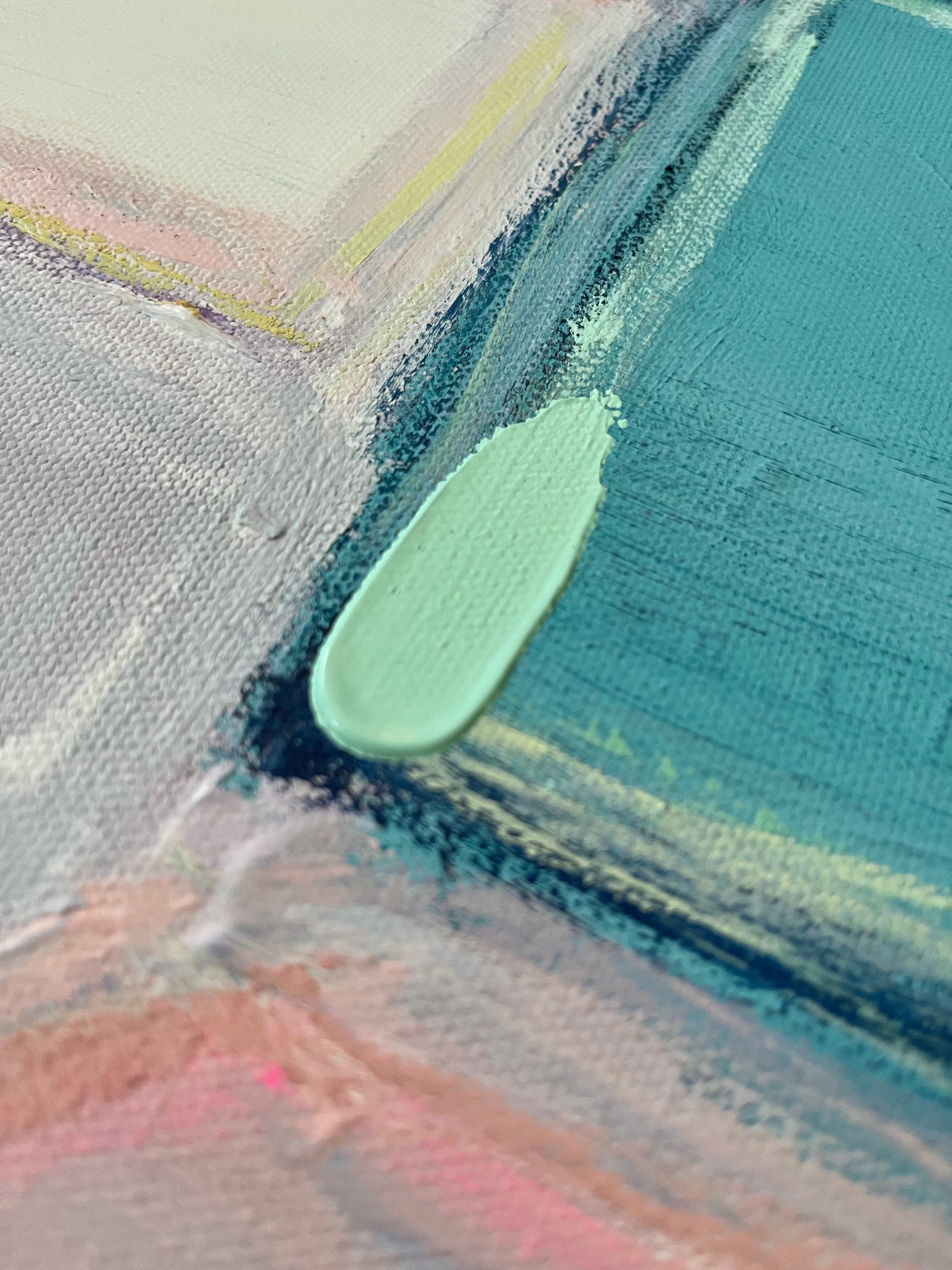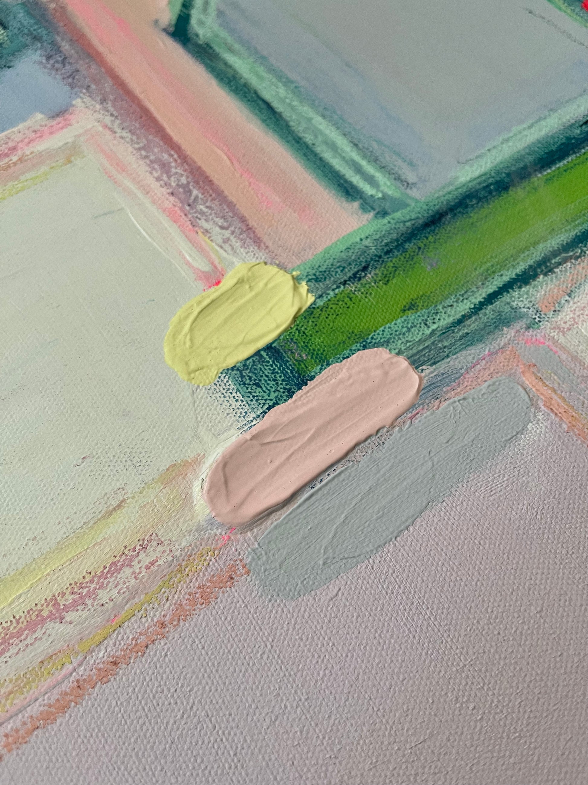 Little House on the Pastel is a 24"x30" mixed media on a traditional profile stretched cotton canvas featuring various pastel colors contrasting dark linear greens and blues, with varying textures and 3D pops of acrylic layers.