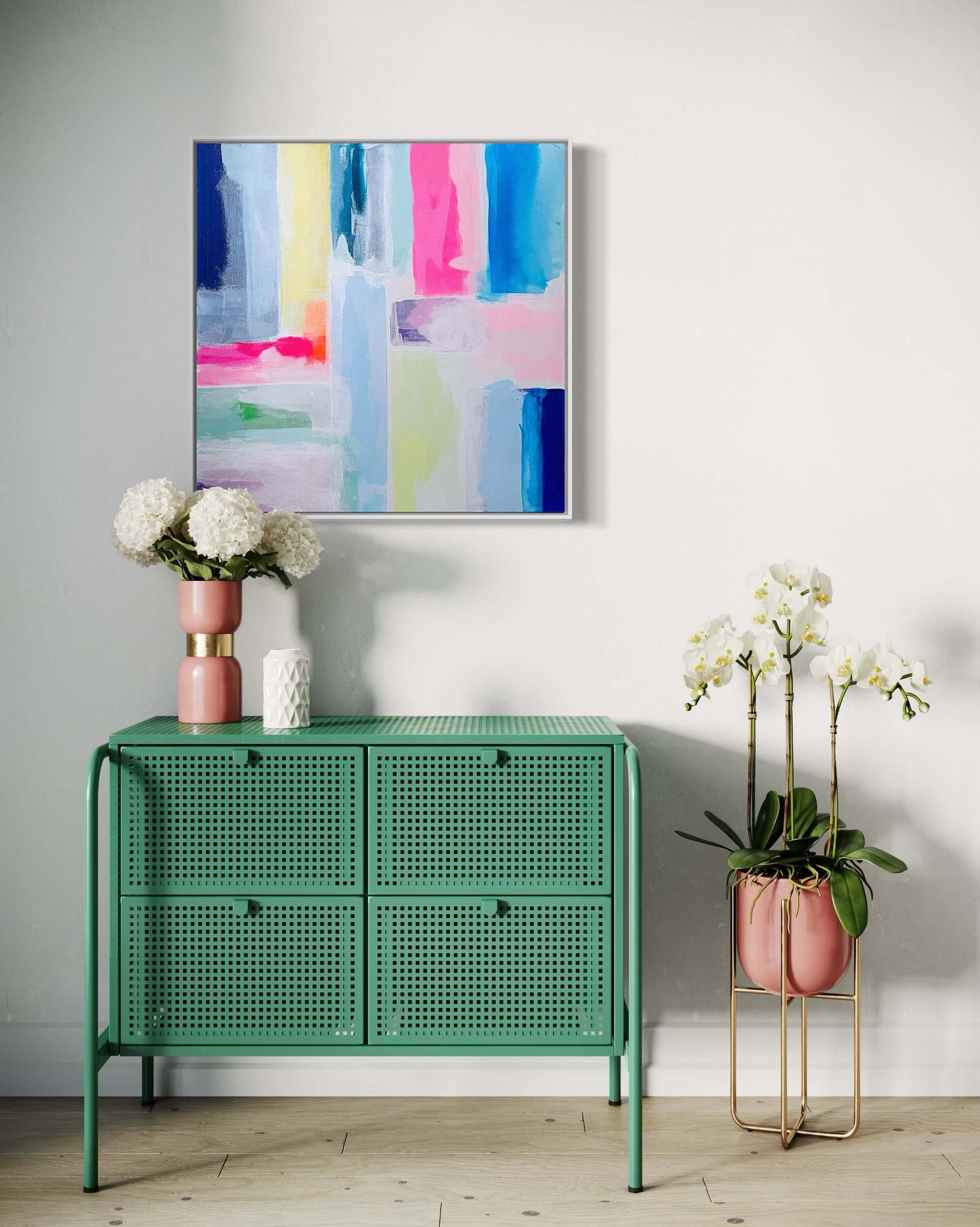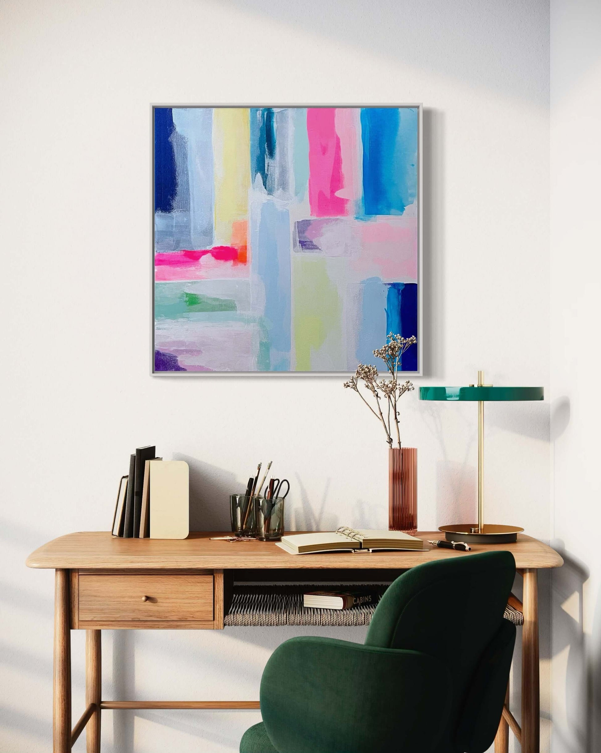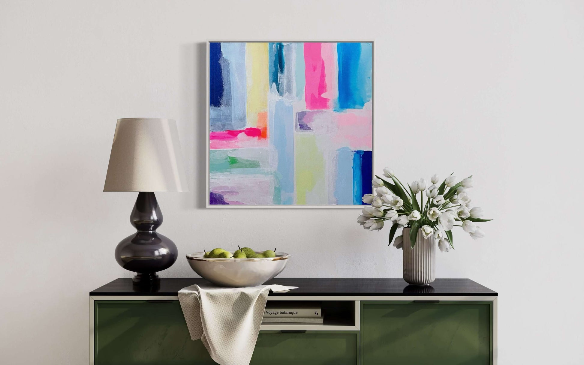 "Paradise" is a 24"x24" original painting on a gallery profile canvas that evokes happiness with layers of vibrant colors and pastel shades that contrast strokes of white.