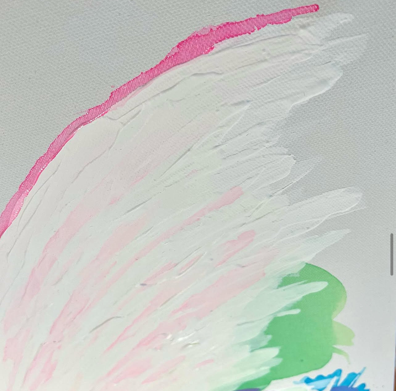 "Rainbow Wings"| A vibrant 24"x24" mixed media, heavily textured original painting on a traditional profile stretched canvas. Watercolor inks lay flat on the canvas's surface while heavy bodied acrylics provide texture and composition. Two white wings sit atop shimmery pink inks. Comes ready to hang with a certificate of authenticity!