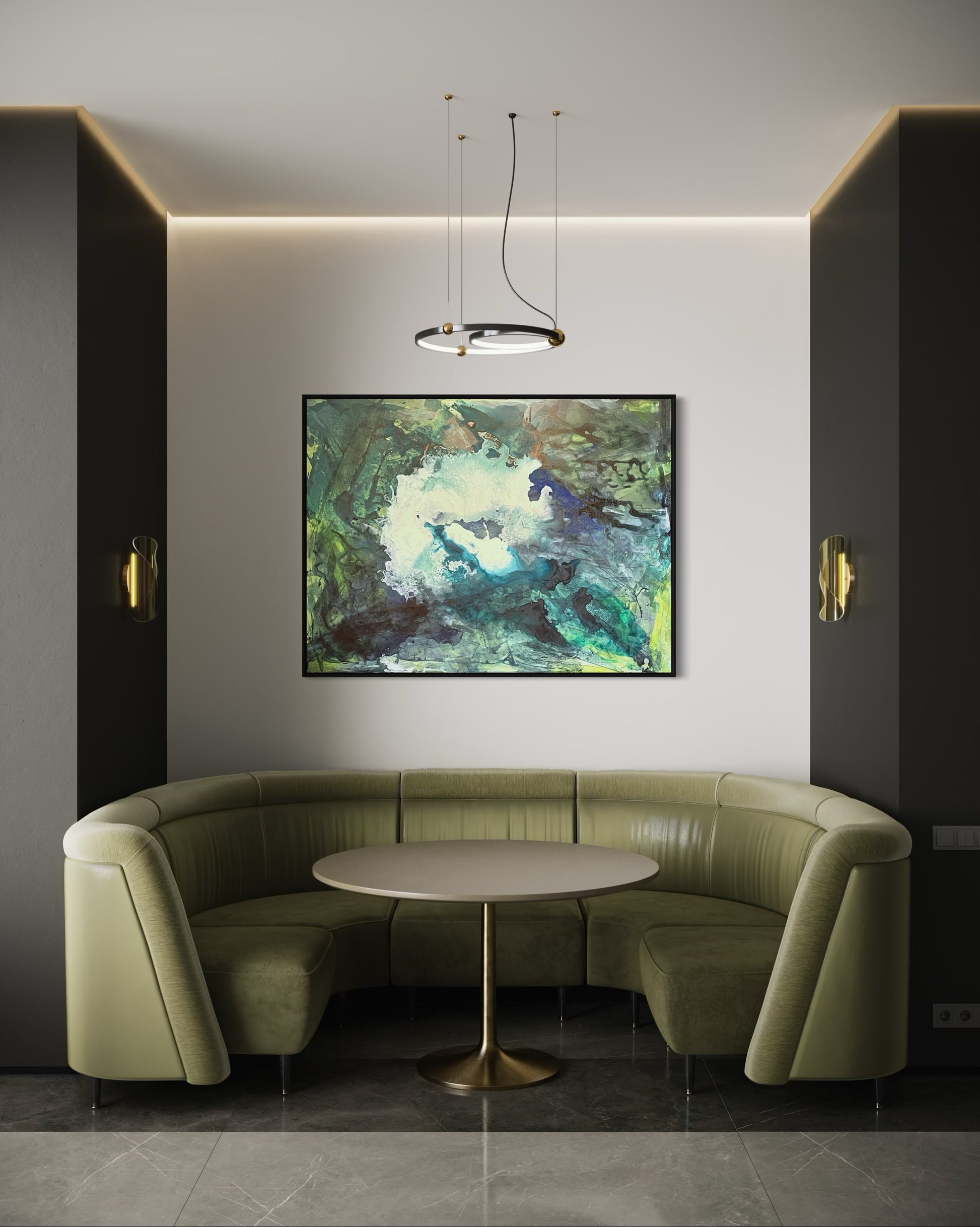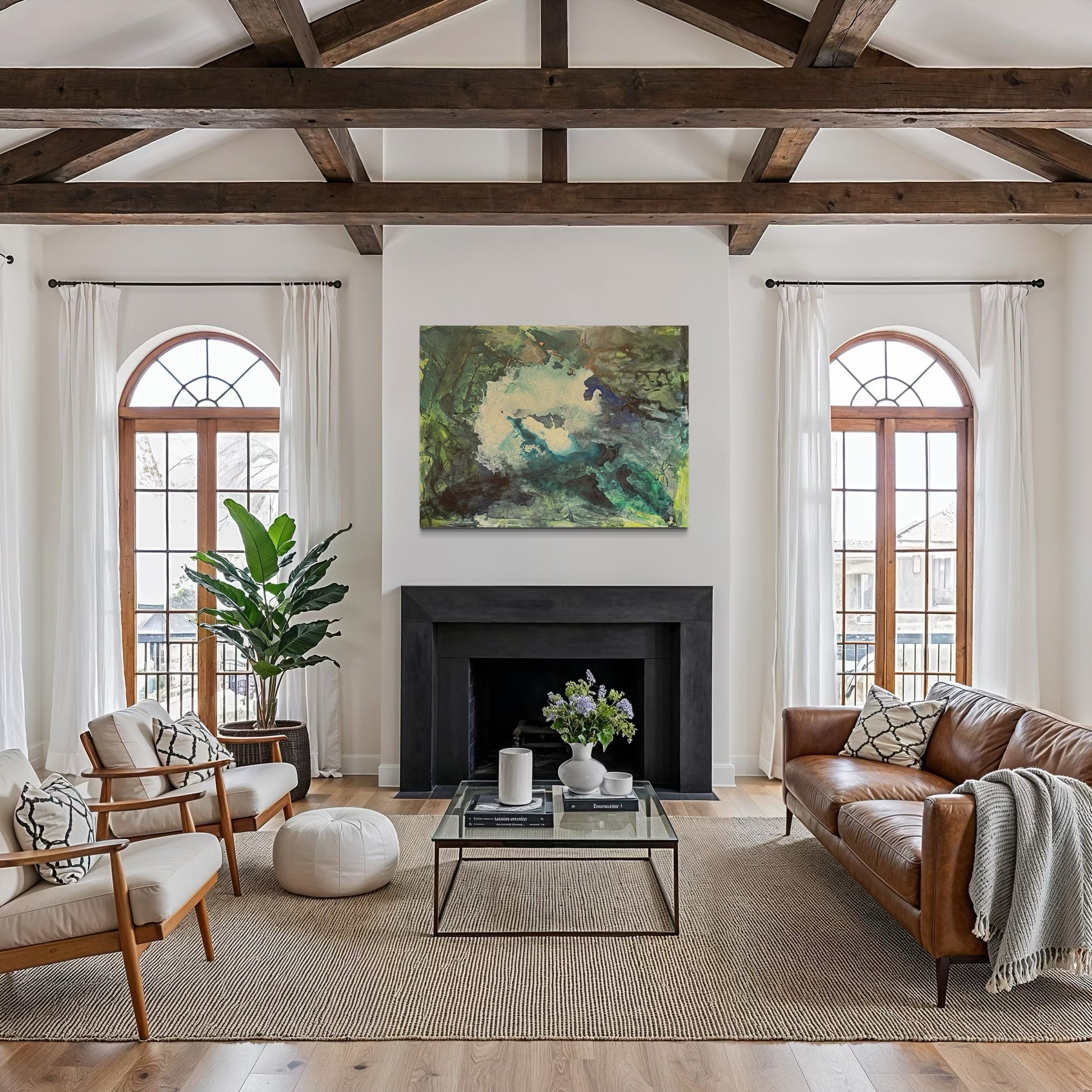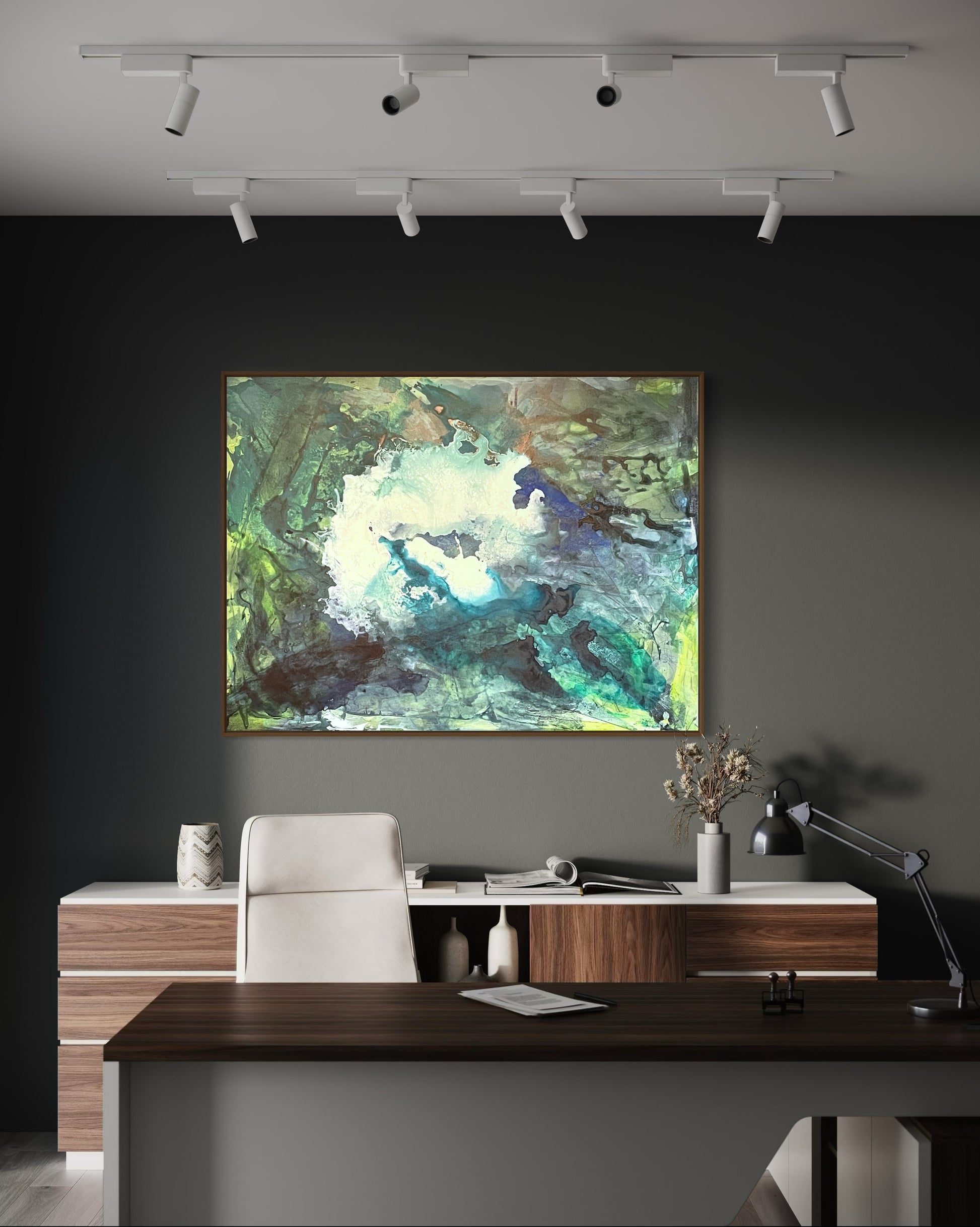 This painting invites contemplation and escape, offering a sense of peace and wilderness in one breath. Whether featured in a modern living space or a creative studio, “Swimming Hole” makes a grounding, energizing statement.