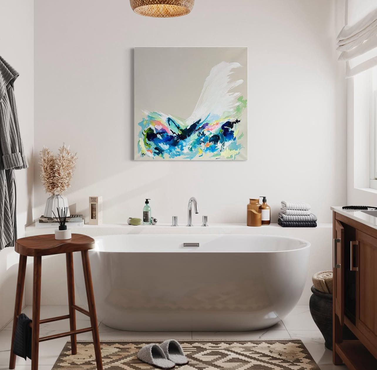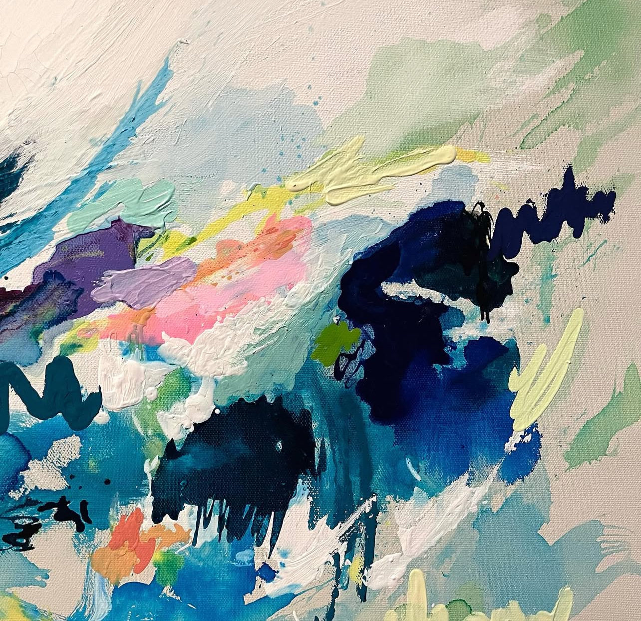 "Wing It" | 36x36" wrapped canvas with a traditional 7/8" profile with a matte almond color background, mixed media textures of acrylic paints and inks, and crisp white accents.