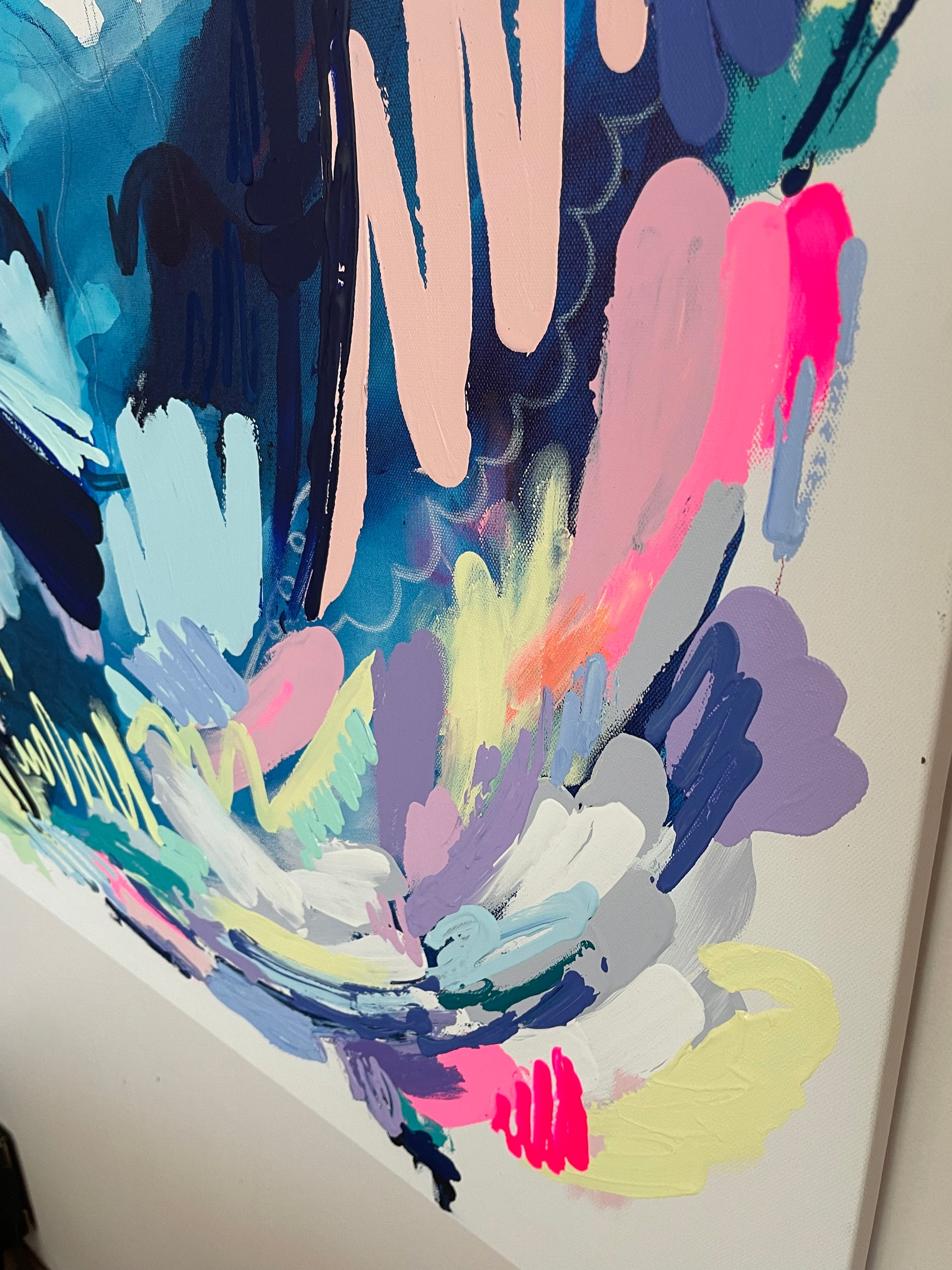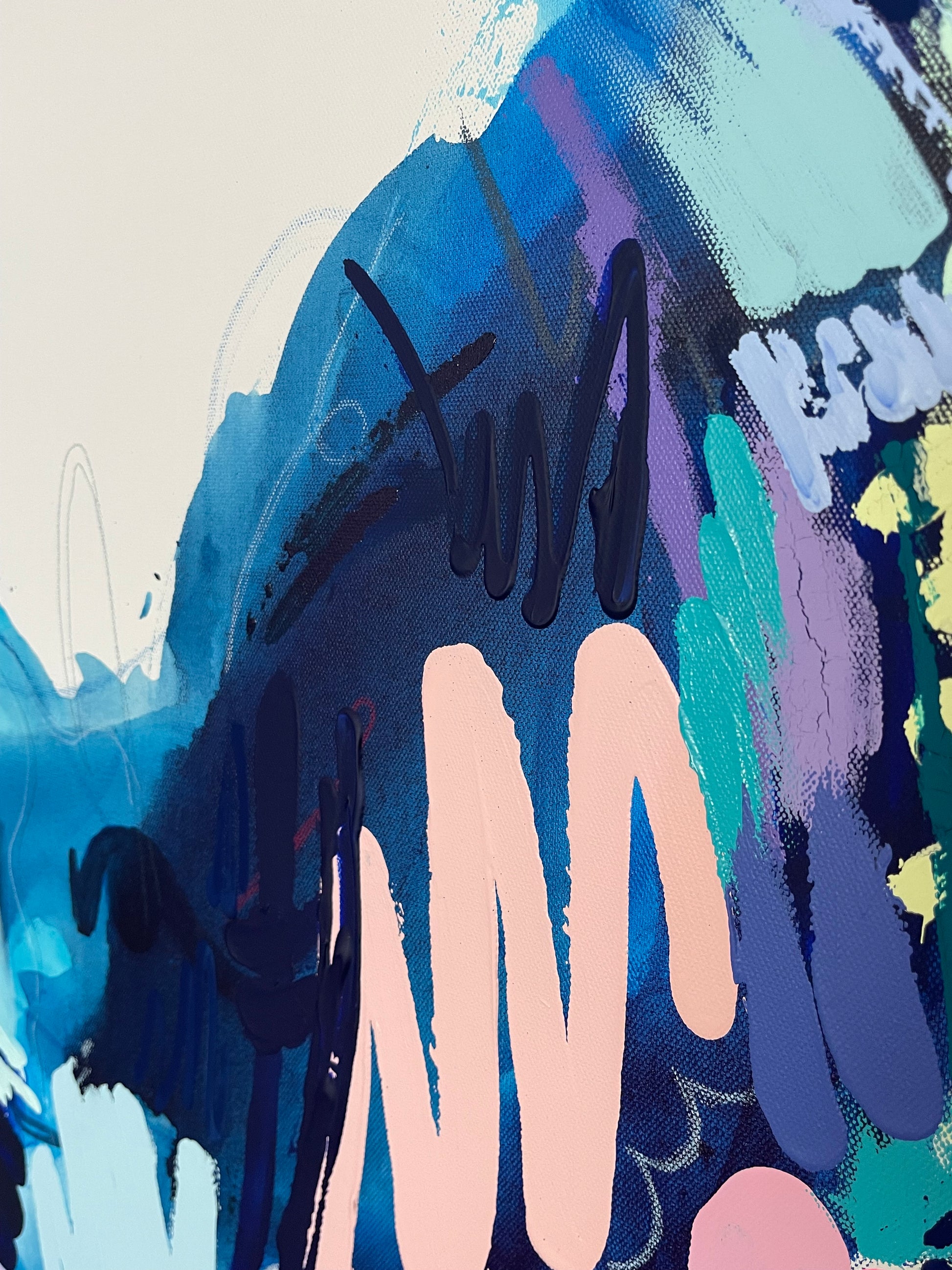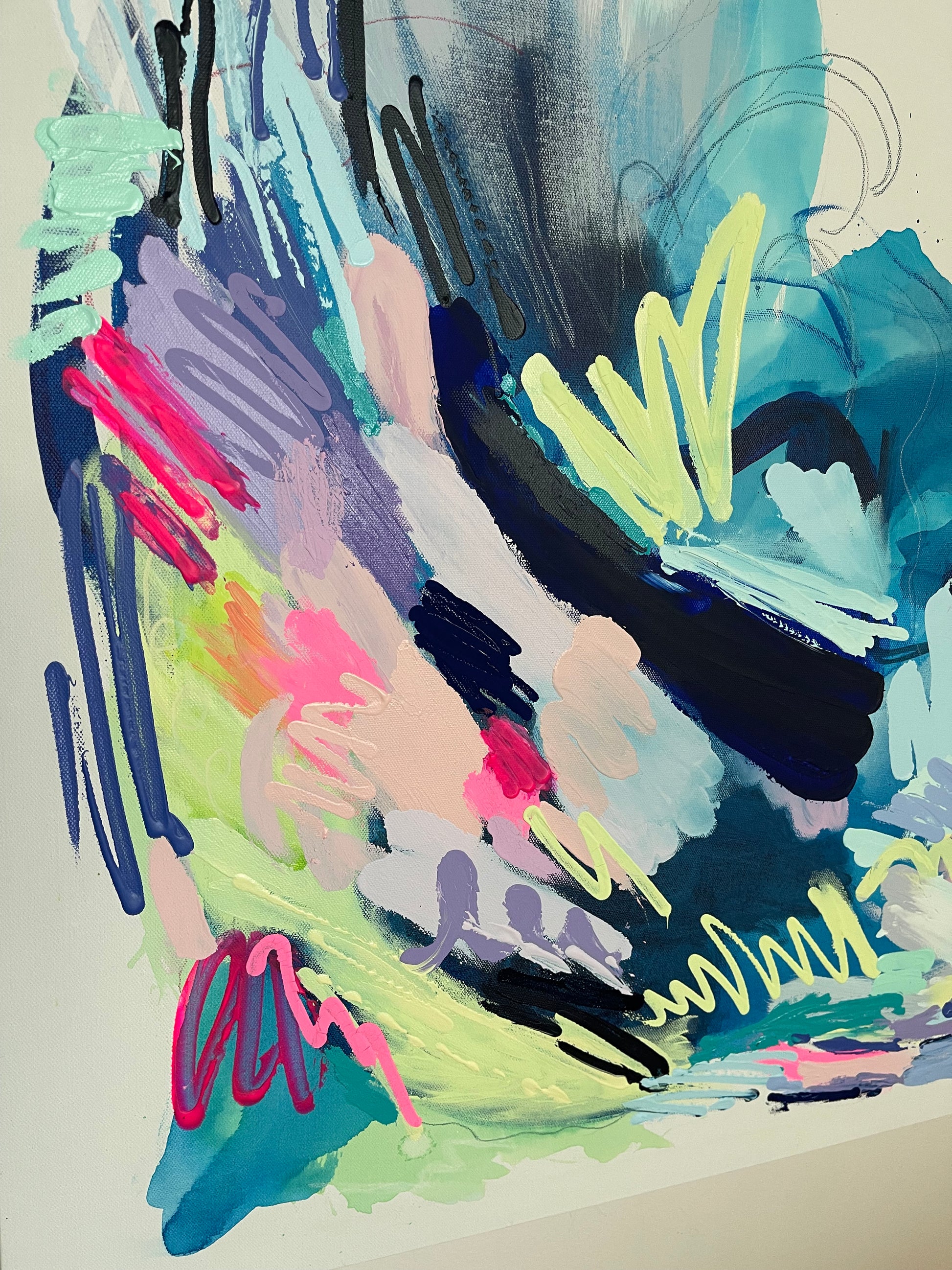 Zhaaa Zhaaa (36”x48”) is an original abstract expressionist painting alive with movement and energy. Vibrant blues flow across the canvas, colliding with neon pinks, lime greens, purples, and soft pastels. Layered brushstrokes, drips, and bold gestures create a dynamic rhythm that feels both chaotic and harmonious. Perfect for a statement wall, this piece brings color, texture, and emotion into any modern space.