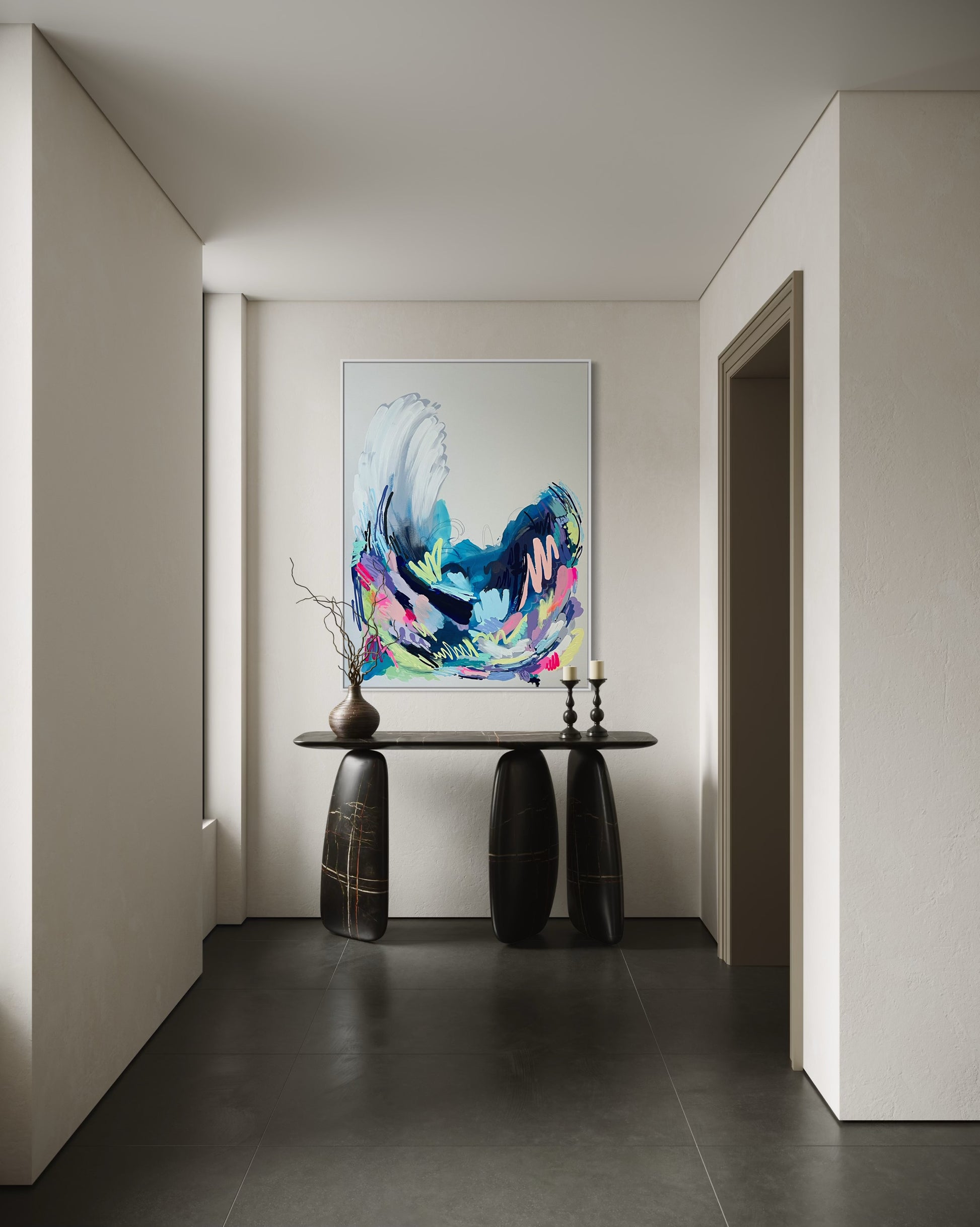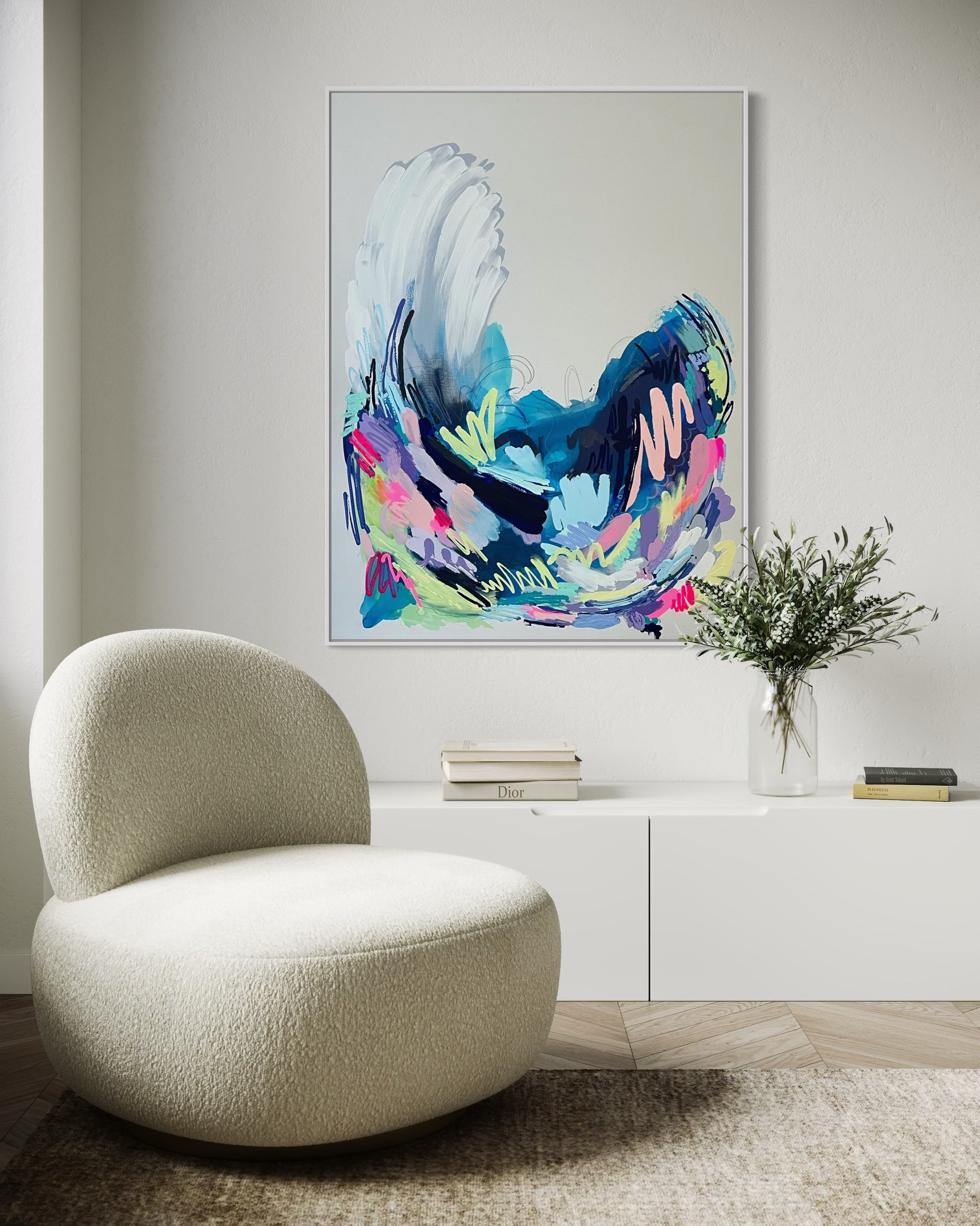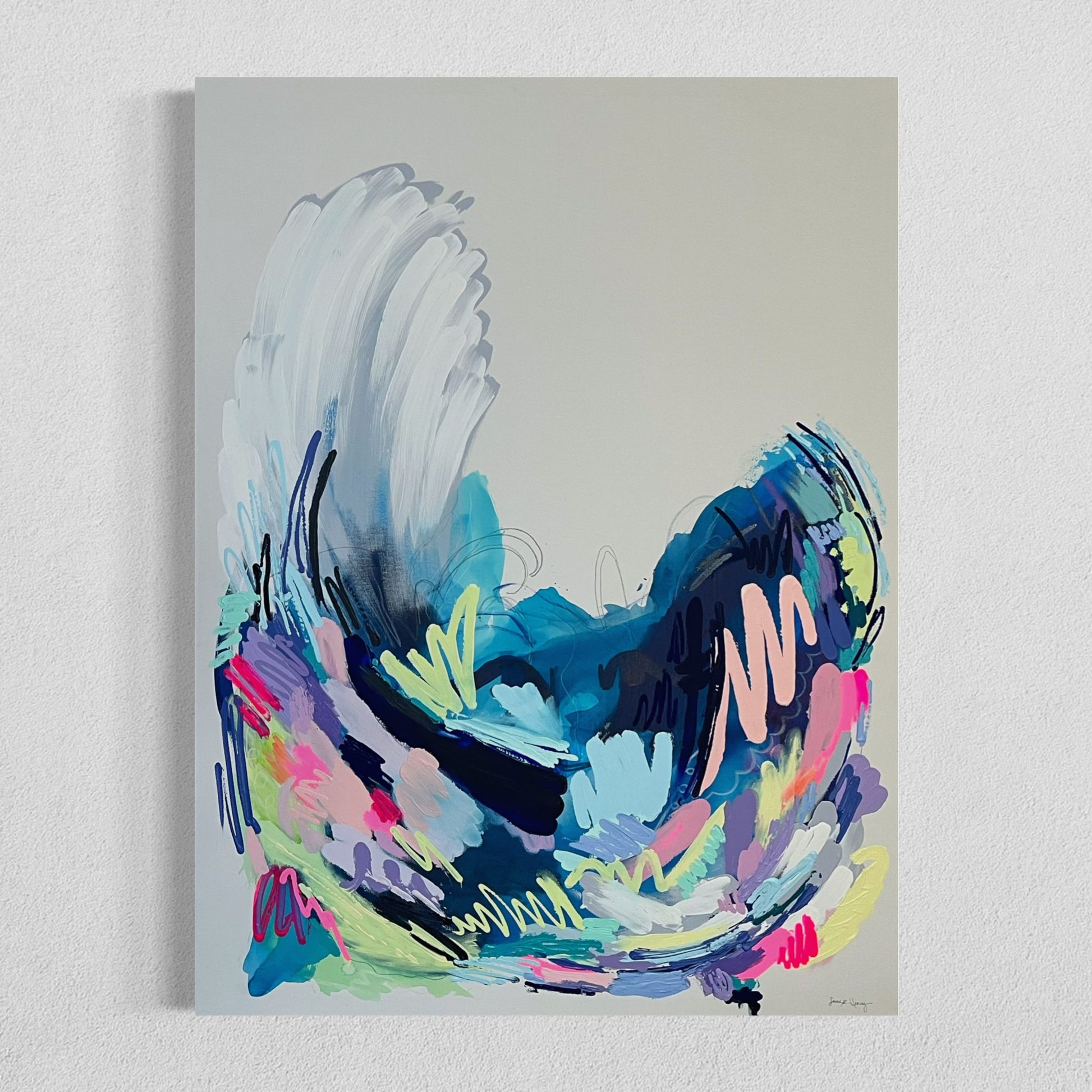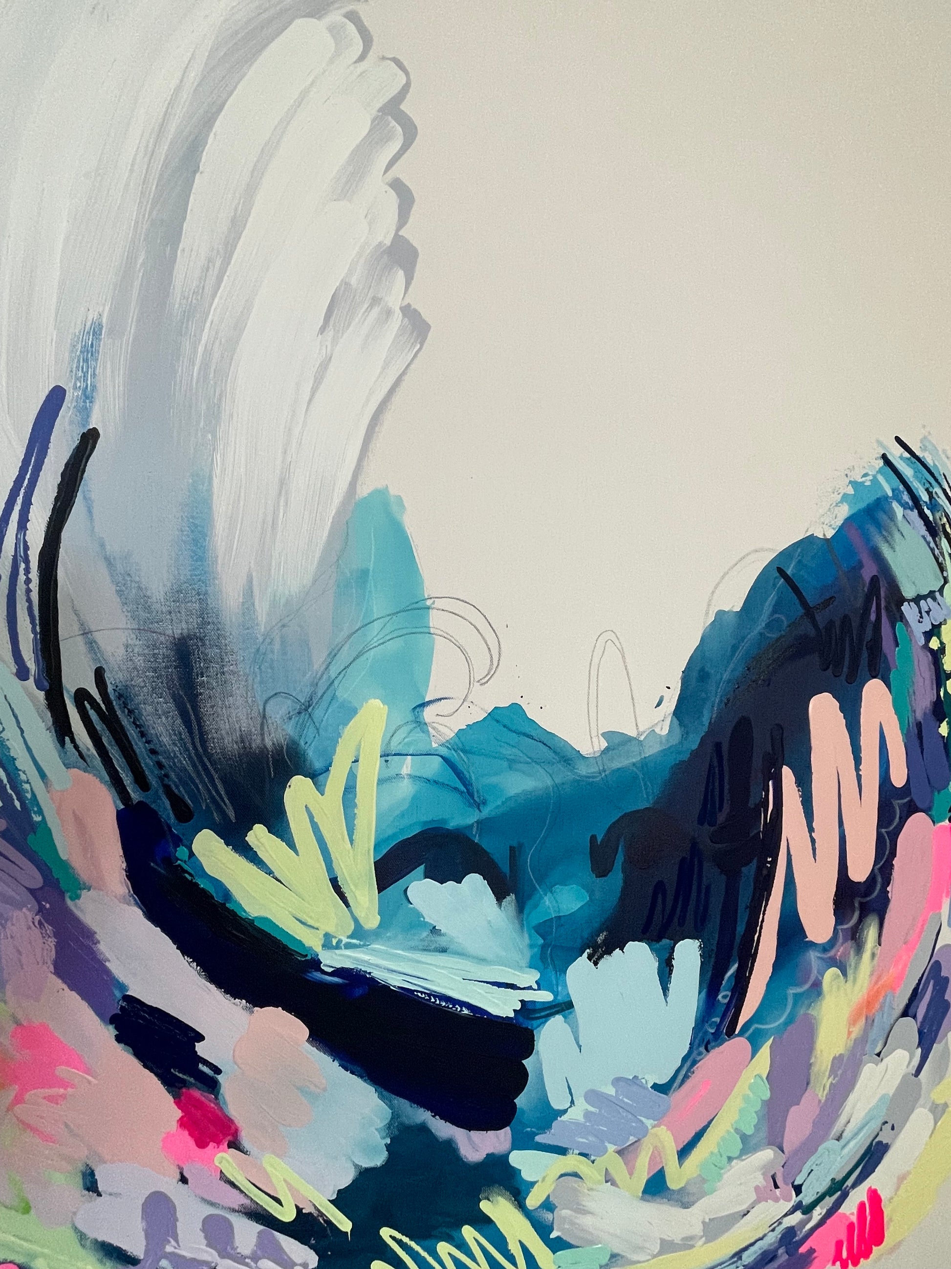 Zhaaa Zhaaa (36”x48”) is an original abstract expressionist painting alive with movement and energy. Vibrant blues flow across the canvas, colliding with neon pinks, lime greens, purples, and soft pastels. Layered brushstrokes, drips, and bold gestures create a dynamic rhythm that feels both chaotic and harmonious. Perfect for a statement wall, this piece brings color, texture, and emotion into any modern space.